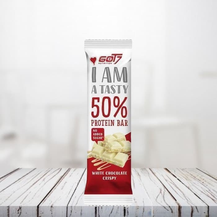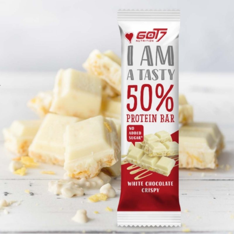 La 50% Protein Bar è una barretta proteica sviluppata dal marchio GOT7. Questa barretta ha la consistenza di una barretta di cioccolato bianco con un cuore croccante come un wafer. Contiene il 50% di proteine, il che è abbastanza raro per una barretta proteica. Inoltre, non contiene zuccheri aggiunti ed è realizzato con vero cioccolato bianco per garantire un piacere di gusto unico.