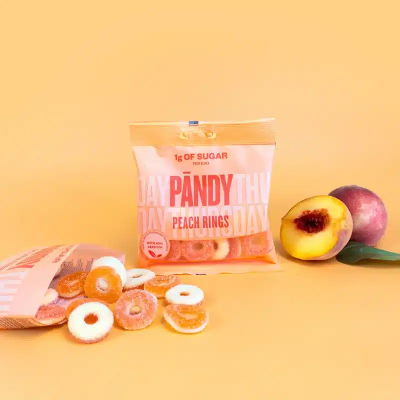 Caramelle schiumose e gelatinose senza zuccheri aggiunti, al gusto di pesca . Contengono dolcificanti.