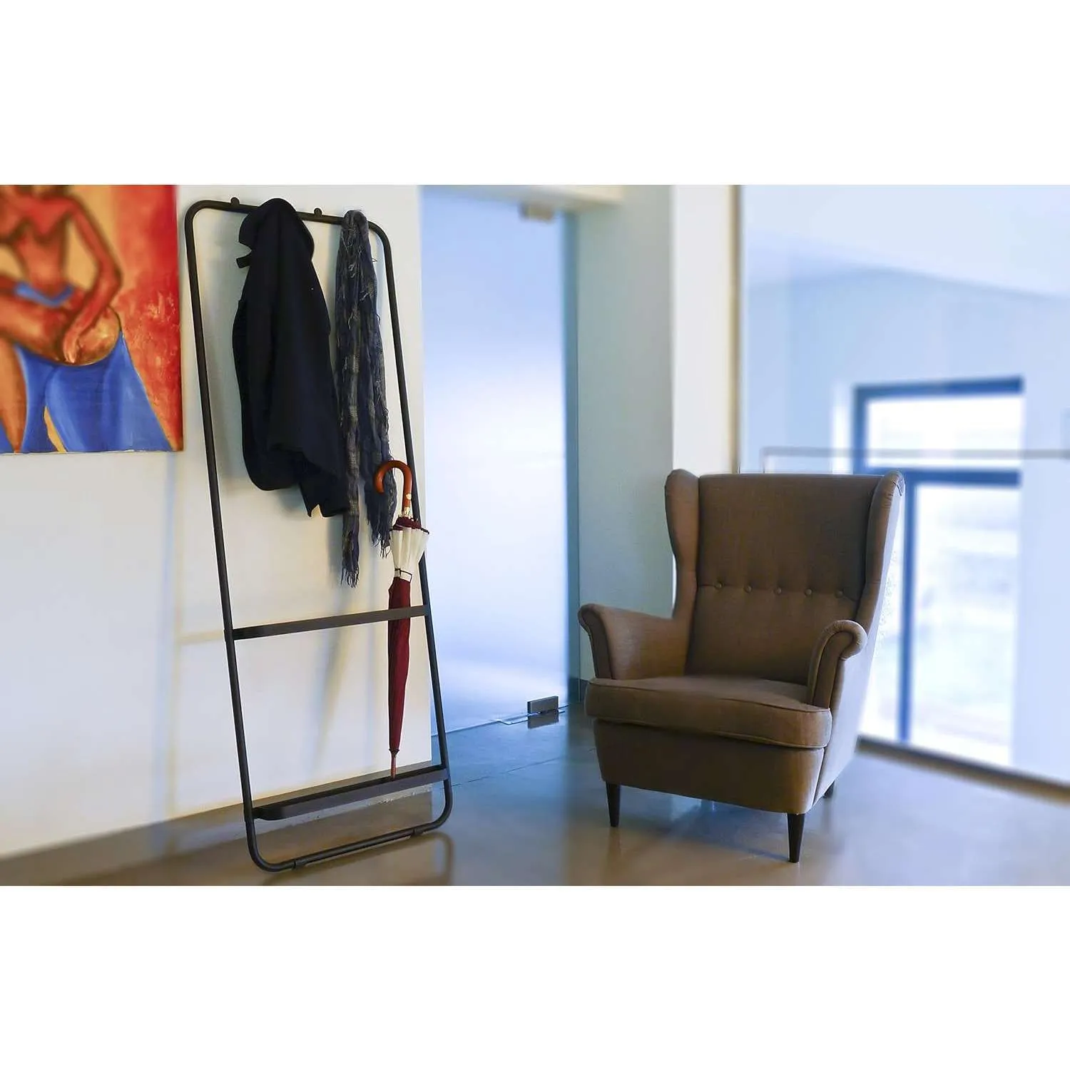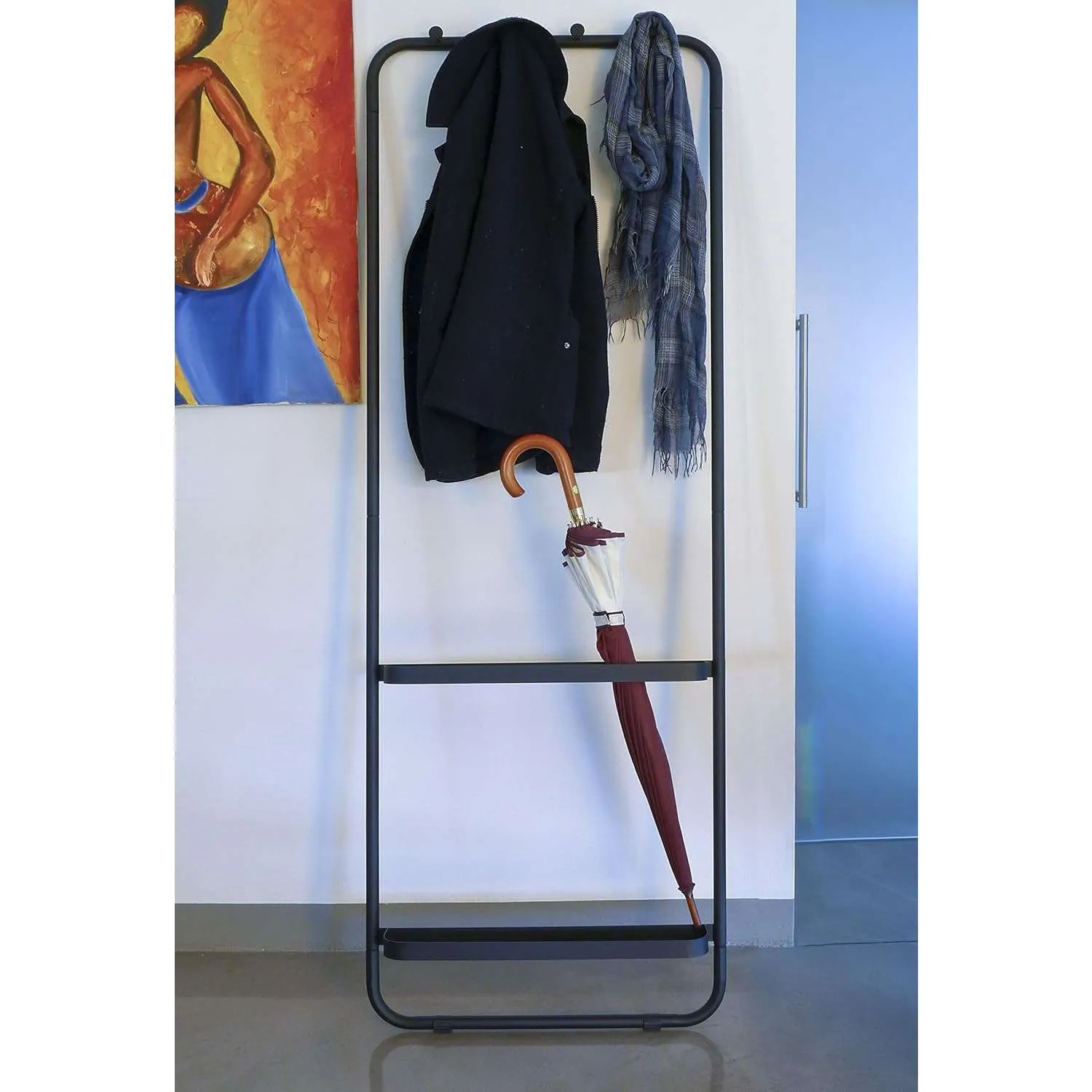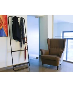 E’ dotato di quattro ganci per appendere borse o giacche e porta ombrelli incorporato nella struttura.