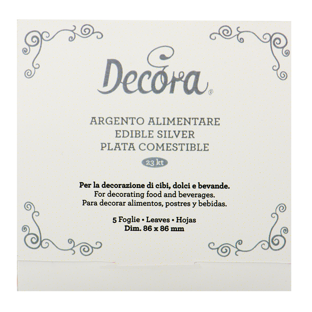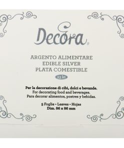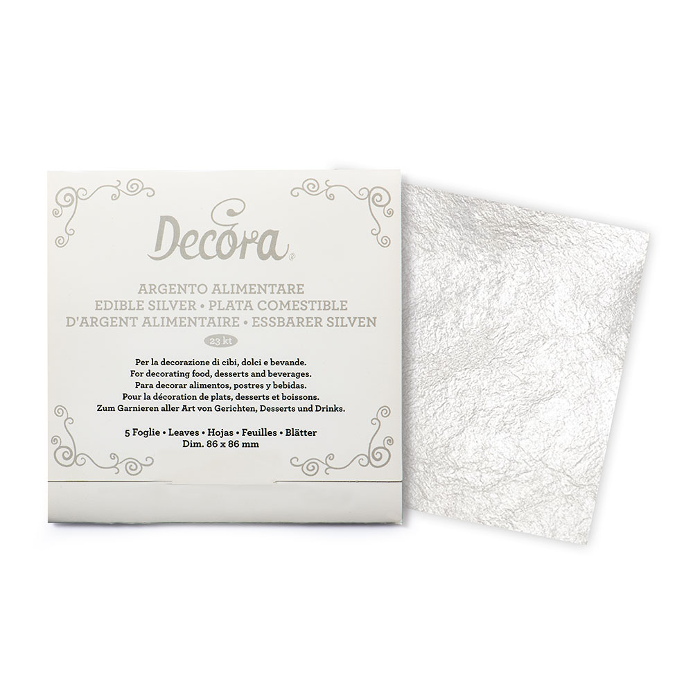 L’argento alimentare Decora è destinato a chi, in occasioni speciali, vuole dilettarsi in decorazioni dal gusto sopraffino e dall’aspetto prezioso. Le foglie, data la loro grandezza e luminosità, vengono utilizzati da chi vuole dare particolare lustro alle proprie proposte.