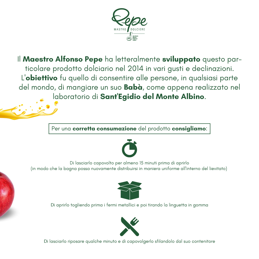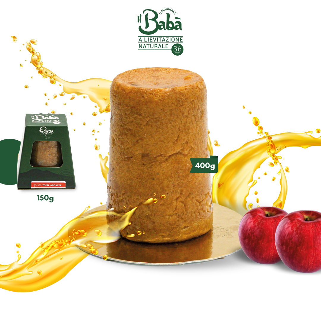 Ingredienti del Babà: Farina di grano tenero 00, Lievito naturale, Uova fresche di categoria A, Zucchero, Burro di latteria 82% MG, Mele annurche semi candite (Mele annurche, Zucchero, Acqua, succo di Limone), Sale, Bacche di Vaniglia del Madagascar