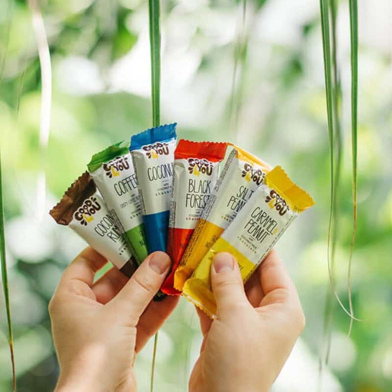 Ingredienti: Fibre alimentari (oligofruttosio, inulina, polidestrosio), cioccolato al latte di cocco con edulcoranti (25%): [burro di cacao, latte di cocco in polvere (19%): (estratto di cocco, amido idrolizzato, alfa-ciclodestrina), edulcoranti: (eritritolo (16 %), glicosidi steviolici (0,01%)), fibre alimentari: (polidestrosio, inulina), cacao magro in polvere, amido di tapioca, emulsionante: lecitina di girasole, aromi], cacao magro in polvere (14%), amido di tapioca, olio di cocco, edulcoranti: (eritritolo (9%), glicosidi steviolici (0,02%)), umettante: glicerolo, emulsionante: lecitina di girasole, aroma, antiossidante: (miscela di alfa-, beta, gamma e delta tocoferoli)