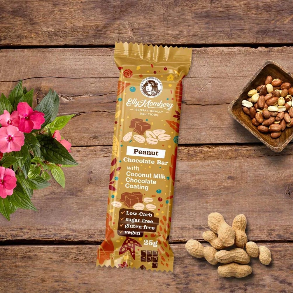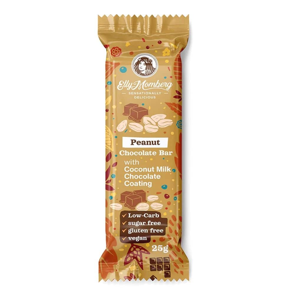 INGREDIENTI: Cioccolato al latte di cocco (25%): [burro di cacao, latte di cocco in polvere (19%), eritritolo (16%), fibre alimentari (polidestrosio, inulina), cacao magro in polvere, amido di tapioca, emulsionante (lecitina di girasole), aromi , glicosidi steviolici (70mg/kg)], arachidi (19%), fibra alimentare (polidestrosio, oligofruttosio), amido di manioca, farina di cocco, eritritolo (3%), umettante (glicerina), olio di cocco, emulsionante (lecitina di girasole), cacao magro in polvere, aroma, antiossidante (miscela di alfa, beta, gamma e delta tocoferolo), glicosidi steviolici (160mg/kg). Dolcificato con edulcoranti salutari.