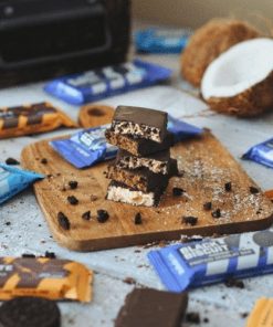 Ingredienti: Umettanti [maltitoli, glicerolo (soia)], rivestimento [edulcorante (maltitolo), grassi vegetali completamente idrogenati (cocco, colza), polvere di cacao magro, emulsionante (lecitine)], cocco grattugiato 15%, concentrato di proteine del siero di latte, fruttoligosaccaridi, latte Concentrato proteico, proteine idrolizzate, grasso di cocco, proteine del siero di latte isolate [isolate di proteine del siero di latte, emulsionante: lecitine (soia)], acqua, farina di mandorle, emulsionante: lecitine (soia), gelificante (carragenina), aromi, conservante (sorbato di potassio) , stabilizzante (cloruro di potassio), antiossidante (alfa-tocoferolo), edulcorante (sucralosio).