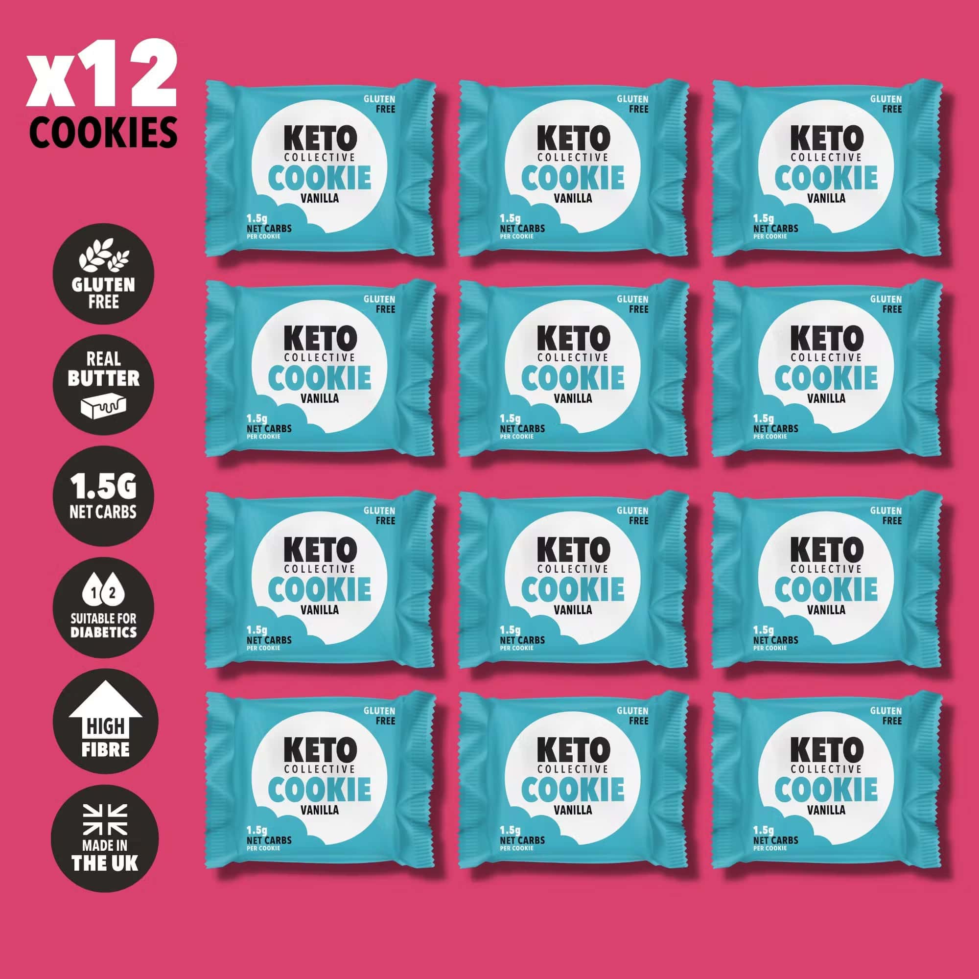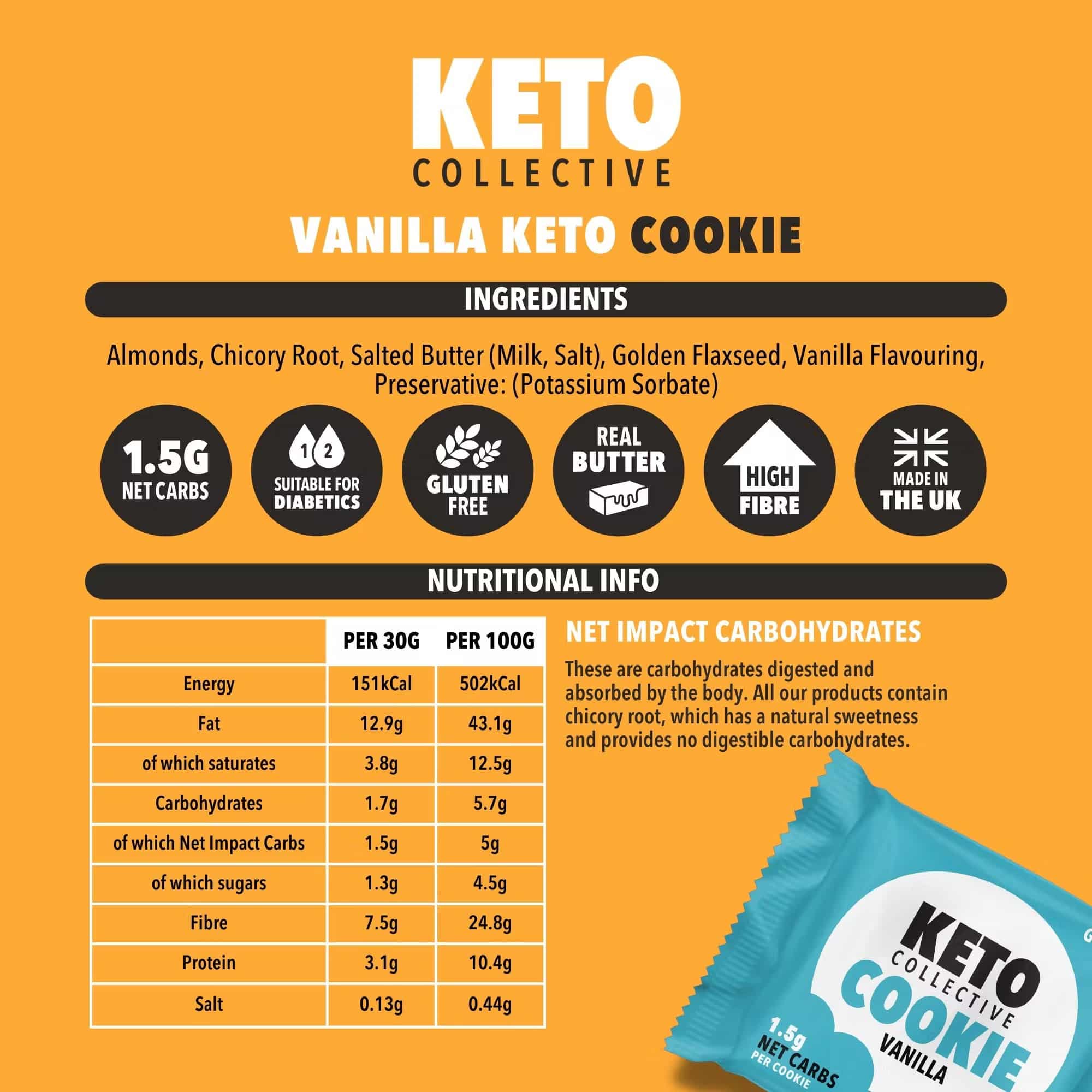 Ecco a voi i Keto Cookie di Keto Collective, il biscotto perfetto per chi cerca uno spuntino delizioso e nutriente! Realizzati nel Regno Unito con vero burro e solo una manciata di ingredienti, questi deliziosi biscotti Choc contengono solo 1,5 g di carboidrati netti ciascuno.
