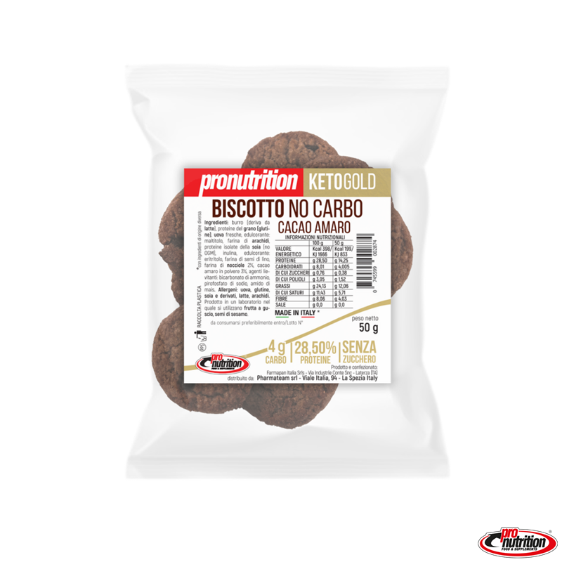 Burro (deriva da latte), proteine del grano (glutine), uova fresche, edulcorante: maltitolo, farina di arachidi, proteine isolate della soia (no OGM), inulina, edulcorante:eritritolo,farina di semi di lino, farina di nocciole 2%, cacao amaro in polvere 3%, agenti lievitanti: bicarbonato di ammonio, pirofosfato di sodio, amido di mais.