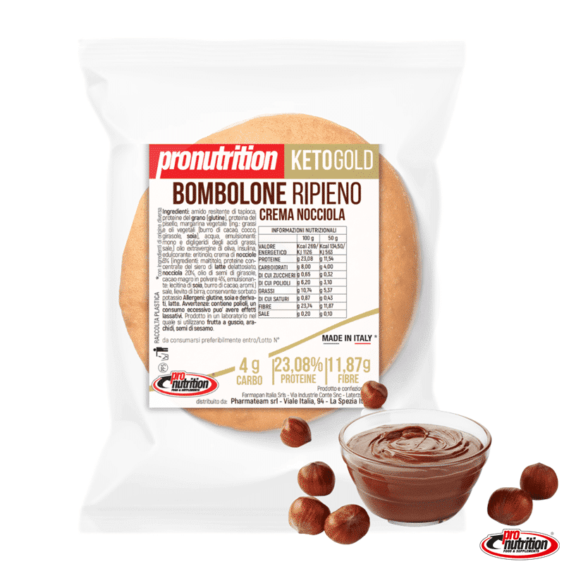 Il BOMBOLONE KETO RIPIENO ALLA NOCCIOLA è un bombolone proteico ripieno di crema alla nocciola, è ricco di proteine (23,08%) e contiene solo 4 grammi di carboidrati per porzione. il BOMBOLONE KETO ALLA NOCCIOLA apporta più di 11 grammi di fibre, che sono utili per la digestione. Questo prodotto è un alimento povero di carboidrati e ricco di proteine, perfetto da utilizzare in un regime alimentare sportivo oppure per chi segue diete ipocaloriche. Il BOMBOLONE KETO ALLA NOCCIOLA è un bombolone light e low sugar, infatti contiene solo 0,32 grammi di zucchero per porzione. E’ ottimo per la prima colazione o per lo snack.