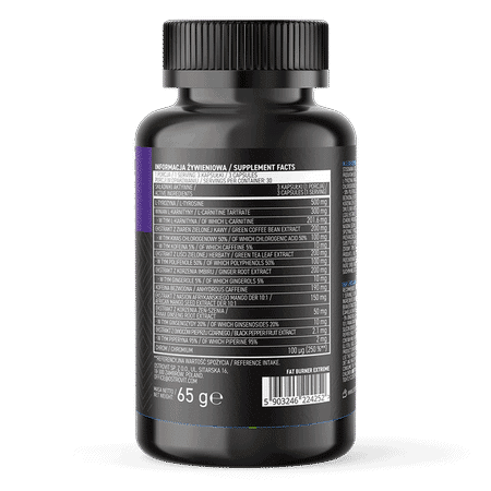 Ingredienti: L-tirosina, L-carnitina tartrato, estratto di chicchi di caffè verde (Coffea arabica L.) – 50% di acido clorogenico e 5% di caffeina, estratto di foglie di tè verde (Camellia sinensis (L.) Kuntze) – 50% di polifenoli, estratto di radice di zenzero (Zingiber officinale Rosc.) – 5% gingeroli, caffeina anidra, estratto di semi di mango africano (Irvingia gabonensis L.) DER 10:1, estratto di radice di panax ginseng (Panax ginseng CA Mey.) – 20% ginsenosidi, agente antiagglomerante: biossido di silicio; composizione di rivestimento (agente di carica: idrossipropilmetilcellulosa), estratto di frutti di pepe nero (Piper Nigrum L.) – 95% piperina, picolinato (cromo).