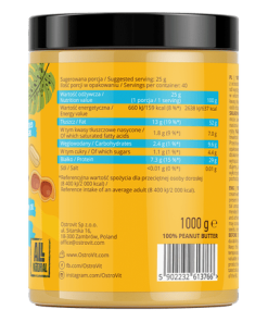 Il burro di arachidi OstroVit 100% è composto al 100% da arachidi. Non contiene sale, zucchero e olio di palma. Le arachidi, chiamate anche earthnuts, si distinguono tra le altre noci per il più alto contenuto proteico. Ricchezza di minerali come il potassio e tutta una serie di altre sostanze preziose per la nostra salute, tra cui il resveratrolo, la rutina o la quercetina. Tutti i prodotti OstroVit sono soprattutto qualità e attenzione ai dettagli. Dopo la macinazione, i prodotti vengono conservati a bassa temperatura, grazie alla quale conservano gli importantissimi acidi grassi omega 3-6-9. Il burro di arachidi OstroVit non è solo un ottimo prodotto che dovrebbe essere trovato nella cucina di ogni buongustaio, ma anche una preziosa fonte di molti componenti.