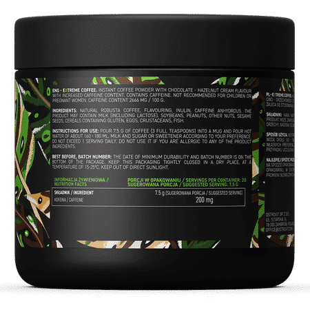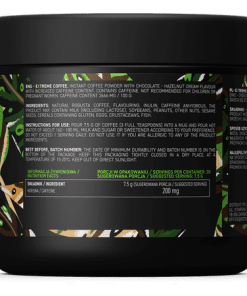 Ingredienti: Caffè robusta naturale, inulina, aromi, caffeina anidra. Caffè solubile in polvere al gusto di cioccolato – crema di nocciole con elevato contenuto di caffeina. Contiene caffeina. Non raccomandato per bambini o donne incinte. Contenuto di caffeina 2666 mg/100 g.