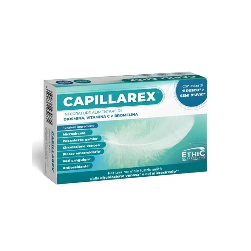 | Ingredienti: Diosmina (da Citrus sinensis (L.) Osbeck, frutto), Agente di carica: cellulosa; Proantocianidine (da Vitis vinifera L., seme), Acido L-ascorbico (vitamina C), Filmatura (agenti di rivestimento: Idrossi-propil-metilcellulosa, talco, gommalacca, polietilenglicole; colorante: carbonato di calcio), Bromelina 2,500 GDU/g (da Ananas comosus (L.) Merr., stipiti), Rusco (Rusco aculeatus L.) rizoma estratto secco tit. 10% saponine calcolate come ruscogenina, Agenti antiagglomeranti: Sali di magnesio degli acidi grassi, Biossido di silicio. | ||
