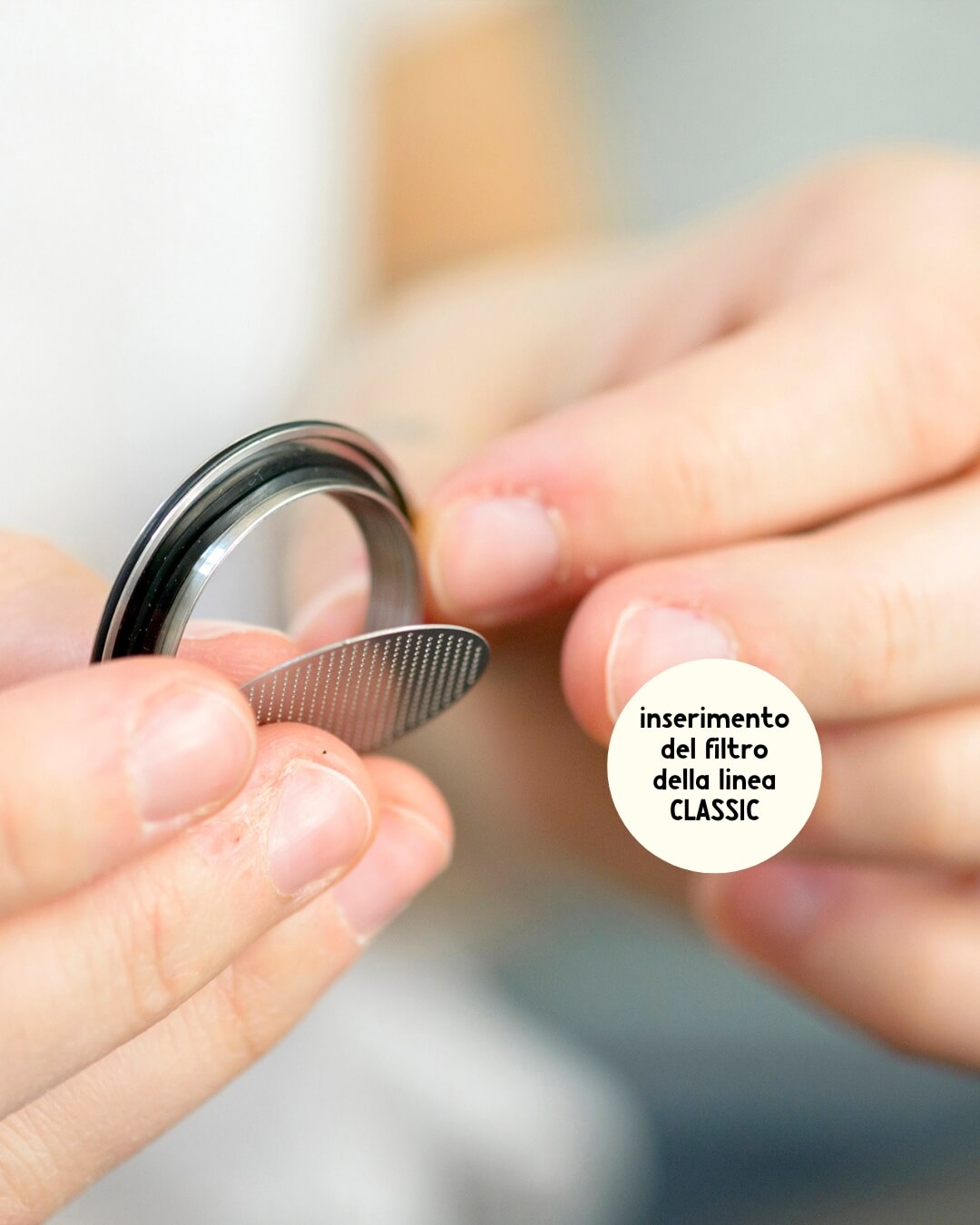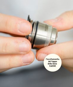 - Inserisci nella capsula ricaricabile la tua miscela di caffè preferita, scegliendo il filtro del tappo in base alla granulosità