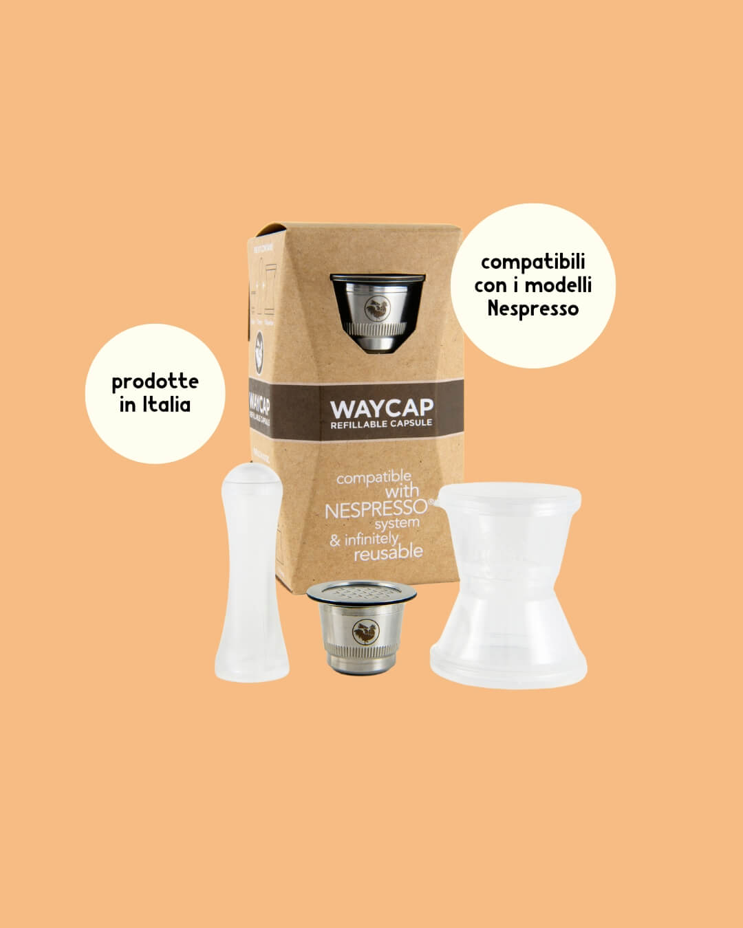 Le capsule riutilizzabili WayCap, made in Italy e compatibili Nespresso, sono pensate per non generare rifiuti a parte il caffè. Sono ricaricabili e riutilizzabili per sempre, e l’utilizzo è davvero semplice.
