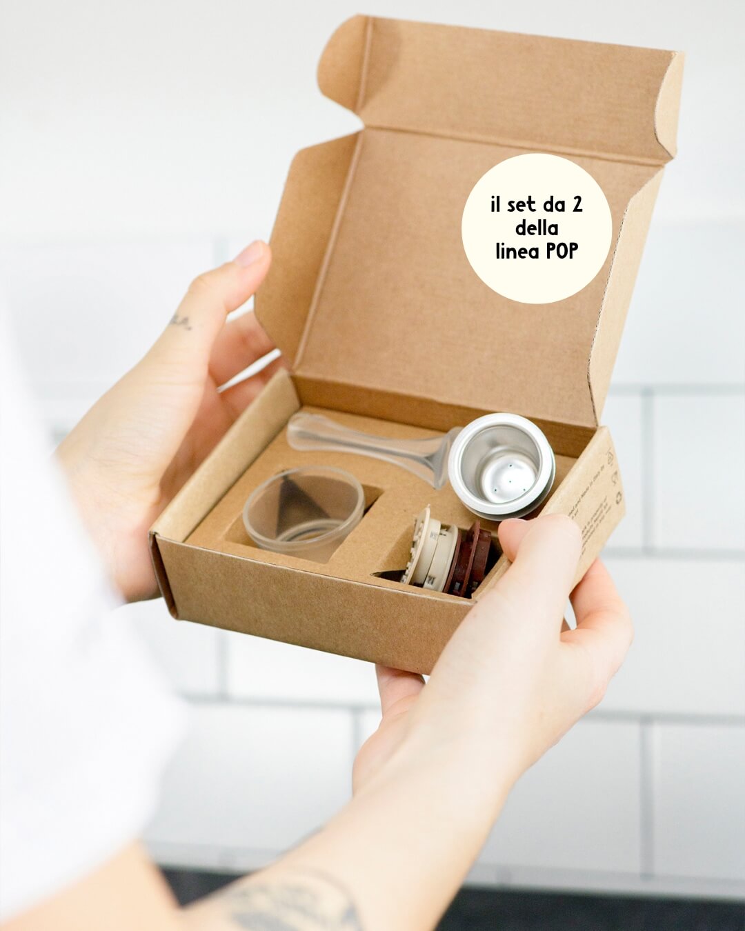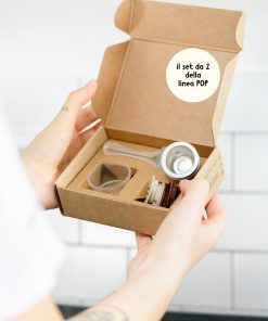 - Kit base: contiene 1 capsula Nespresso ricaricabile (corpo in acciaio e tappo in silicone), 1 dosatore in plastica, 1 pressino in plastica per il caffè, 1 set di filtri in acciaio