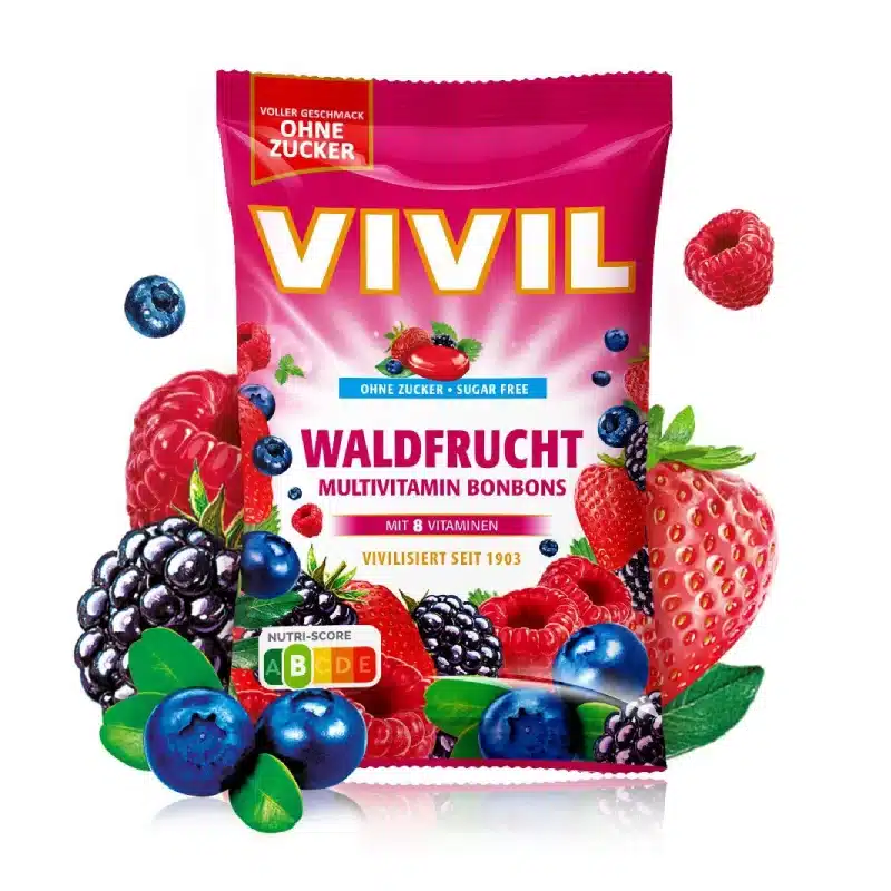 Ingredienti: Edulcoranti: isomalto, sciroppo di maltitolo, acesulfame-K, aspartame; acidificante: acido citrico; Aromi, succhi di frutta concentrati (0,6%): sambuco, ribes nero, mirtillo rosso, mora, fragola, lampone, mirtillo; Vitamina C, Niacina, DL-alfa-tocoferolo acetato, Calcio D-Pantotenato, Piridossina cloridrato, Riboflavina, Biotina, Cianocobalamina.