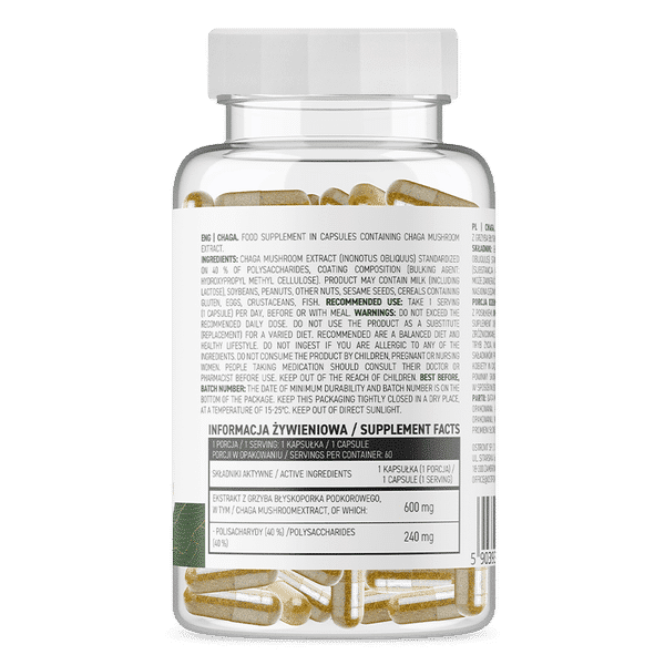 Chaga, noto anche come inonotus obliquus, è un tipo di fungo parassita utilizzato da secoli nella medicina popolare. Chaga si verifica principalmente nel nord della Cina e in Siberia. Occasionalmente puoi trovarlo anche in Polonia. Chaga contiene una serie di ingredienti che promuovono la salute, come fenoli, steroli, riboflavina, acido pantotenico, melanina, superossido dismutasi e beta-glucano. È anche una ricca fonte di vitamine del gruppo B e numerosi minerali, ad esempio potassio, calcio, manganese, ferro e zinco.