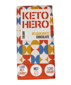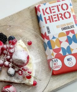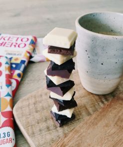 Ingredienti: burro di cacao, latte intero in polvere (18%), inulina, edulcorante : eritritolo, pasta di cacao, proteine del latte, emulsionante: lecitina di girasole, estratto di vaniglia, edulcorante: glicosidi steviolici, MCT in polvere. Cacao: 33% minimo. Questo cioccolato può contenere tracce di frutta a guscio.