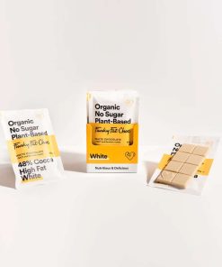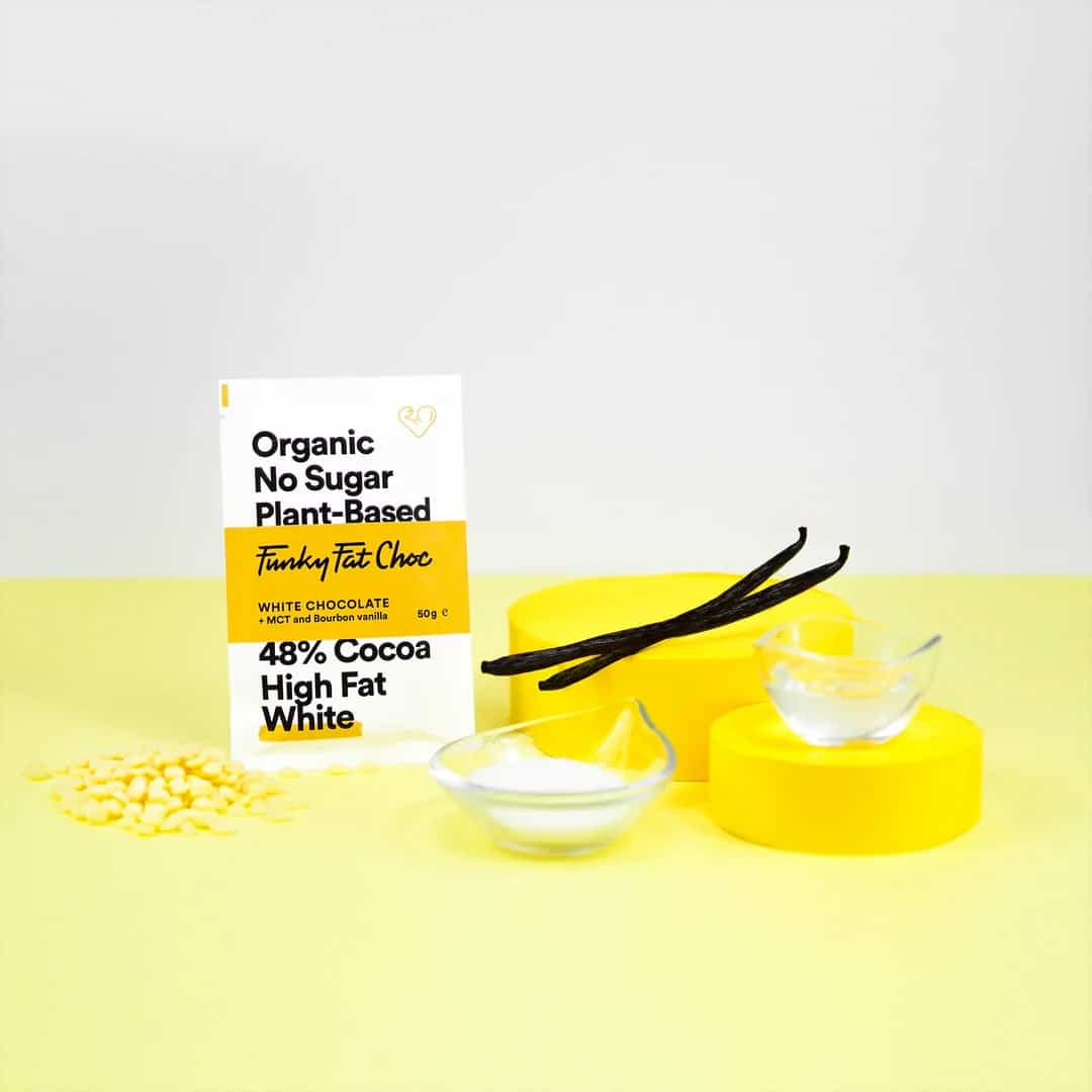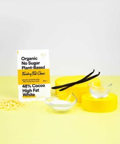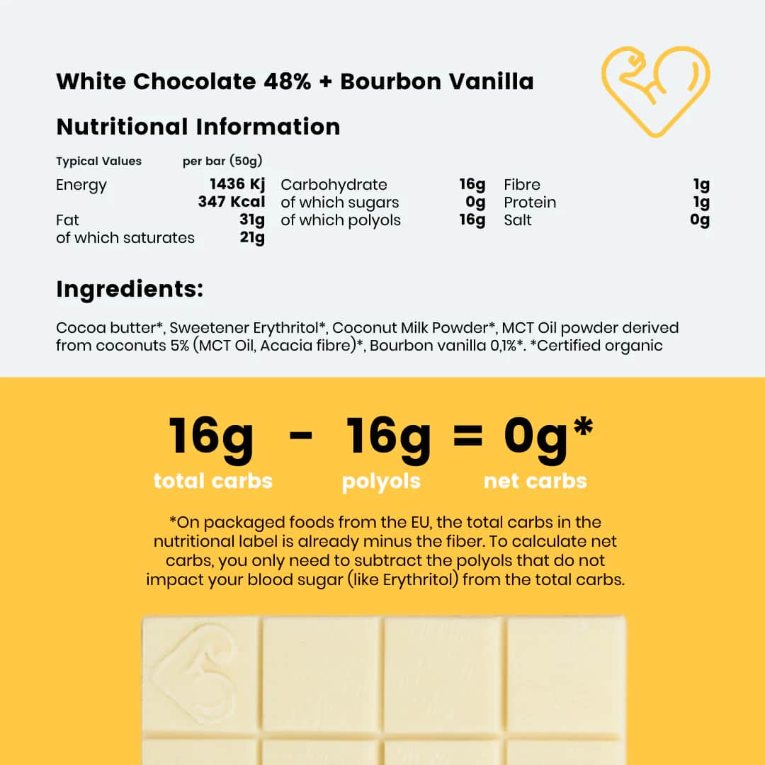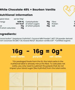 Ingredienti: Burro di Cacao 48%, Eritritolo, Latte di Cocco in polvere, Olio MCT in Polvere con Fibra di Acacia (100% derivato da noci di cocco), Vaniglia Bourbon.