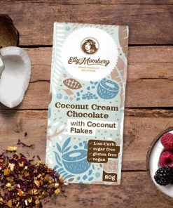 Ingredienti: Burro di cacao, latte di cocco in polvere (19%), eritritolo (16%), fibre alimentari (polidestrosio, inulina), cacao magro in polvere, amido di tapioca, emulsionante (lecitina di girasole), aromi, glicosidi steviolici (70mg/kg. Dolcificato con edulcoranti salutari.
