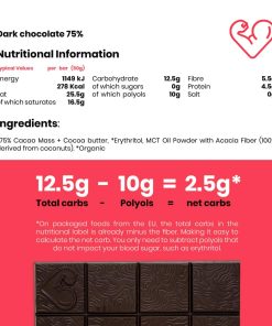 Ingredienti: 75% massa di cacao* + burro di cacao*, eritritolo*, polvere di olio MCT con fibra di acacia (100% derivato da noci di cocco).