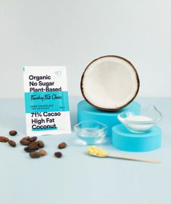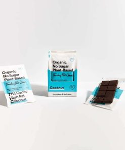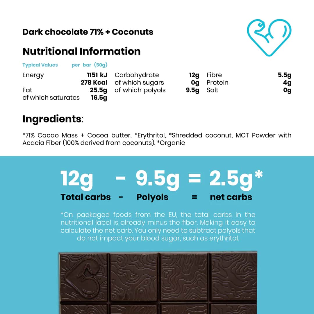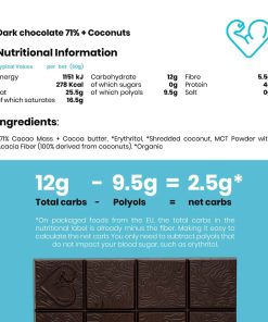 Ingredienti: Massa di cacao 71% + burro di cacao, eritritolo, cocco grattugiato, polvere MCT con fibra di acacia (derivata al 100% da noci di cocco).