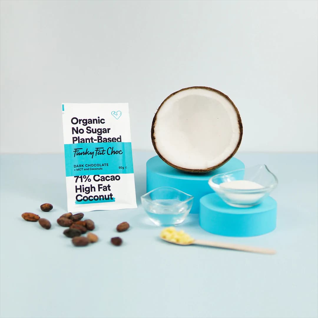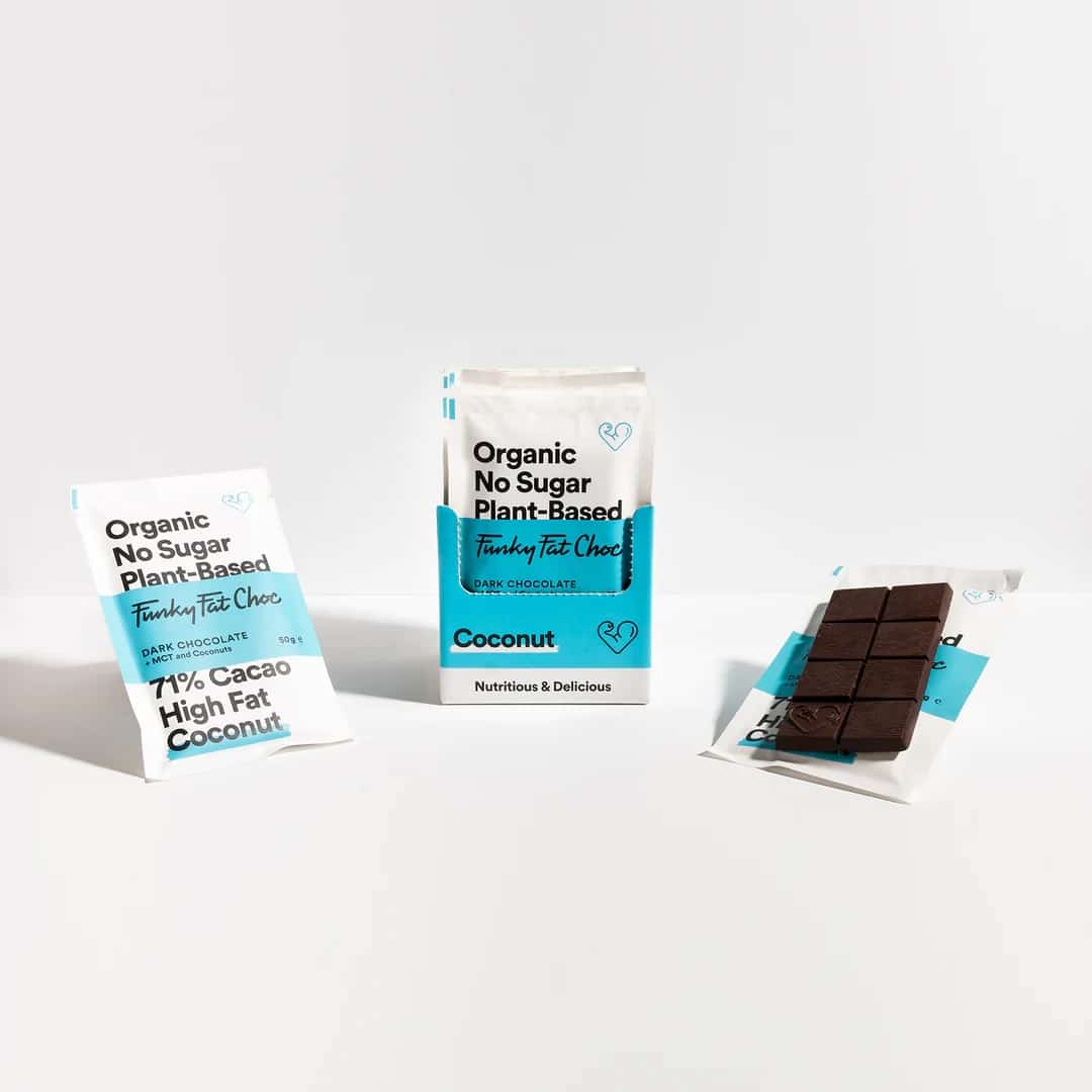 Il cioccolato fondente al cocco di Funky Fat Foods ha un alto apporto di grassi derivanti da burro di cacao e cocco, è addizionato di MCT e dolcificato esclusivamente con eritritolo. Un cioccolato speciale per chi segue una dieta chetogenica, goloso ma al contempo con pochissimi carboidrati.