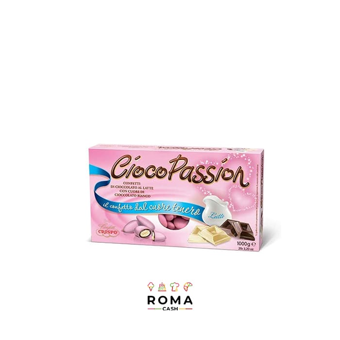 Confetti Ciocopassion Rosa, da 1 Kg di Crispo: confetti rosa, con finissimo cioccolato al latte, ripieni al cioccolato bianco e confettati color rosa.