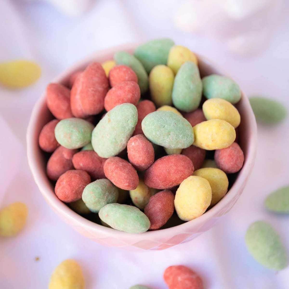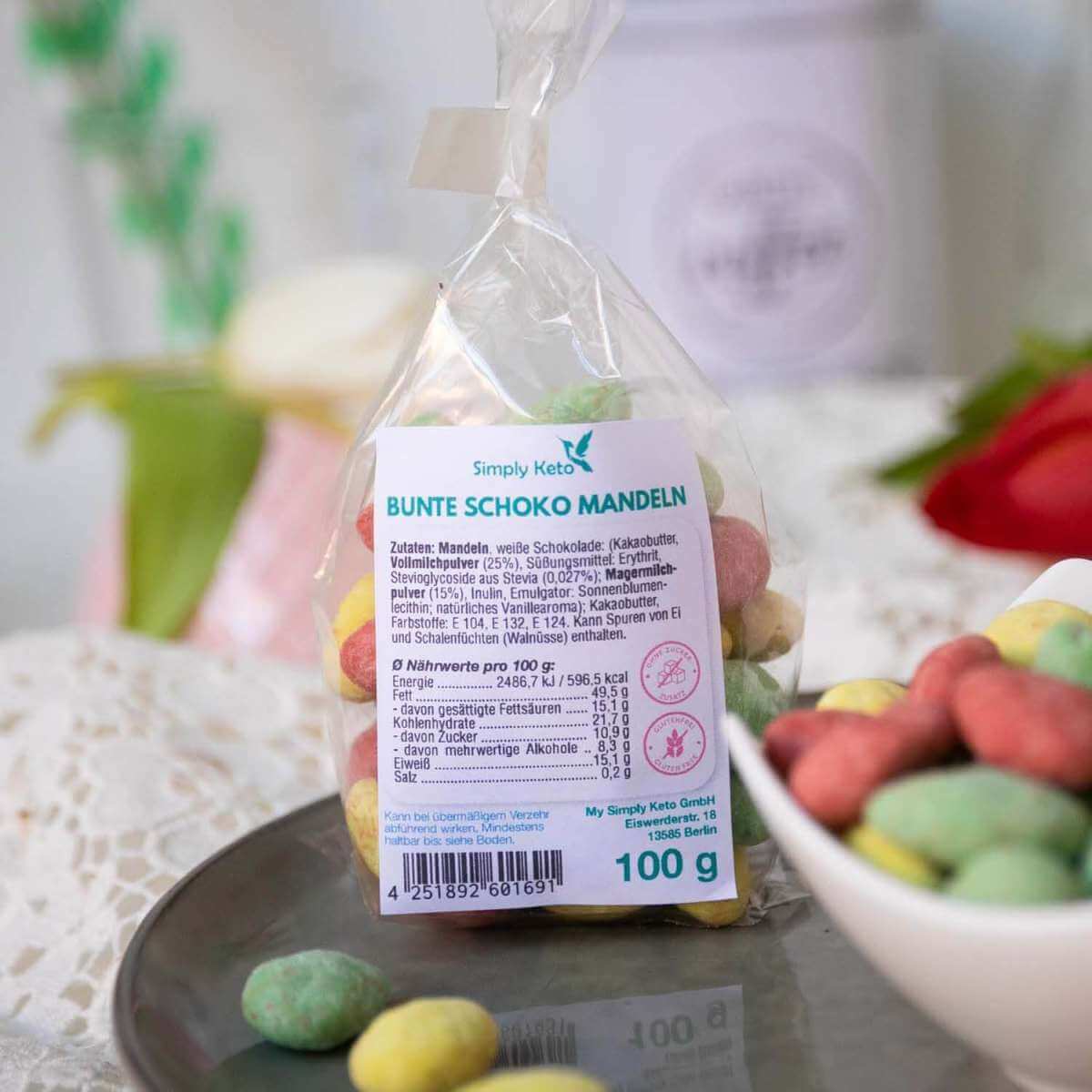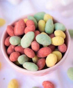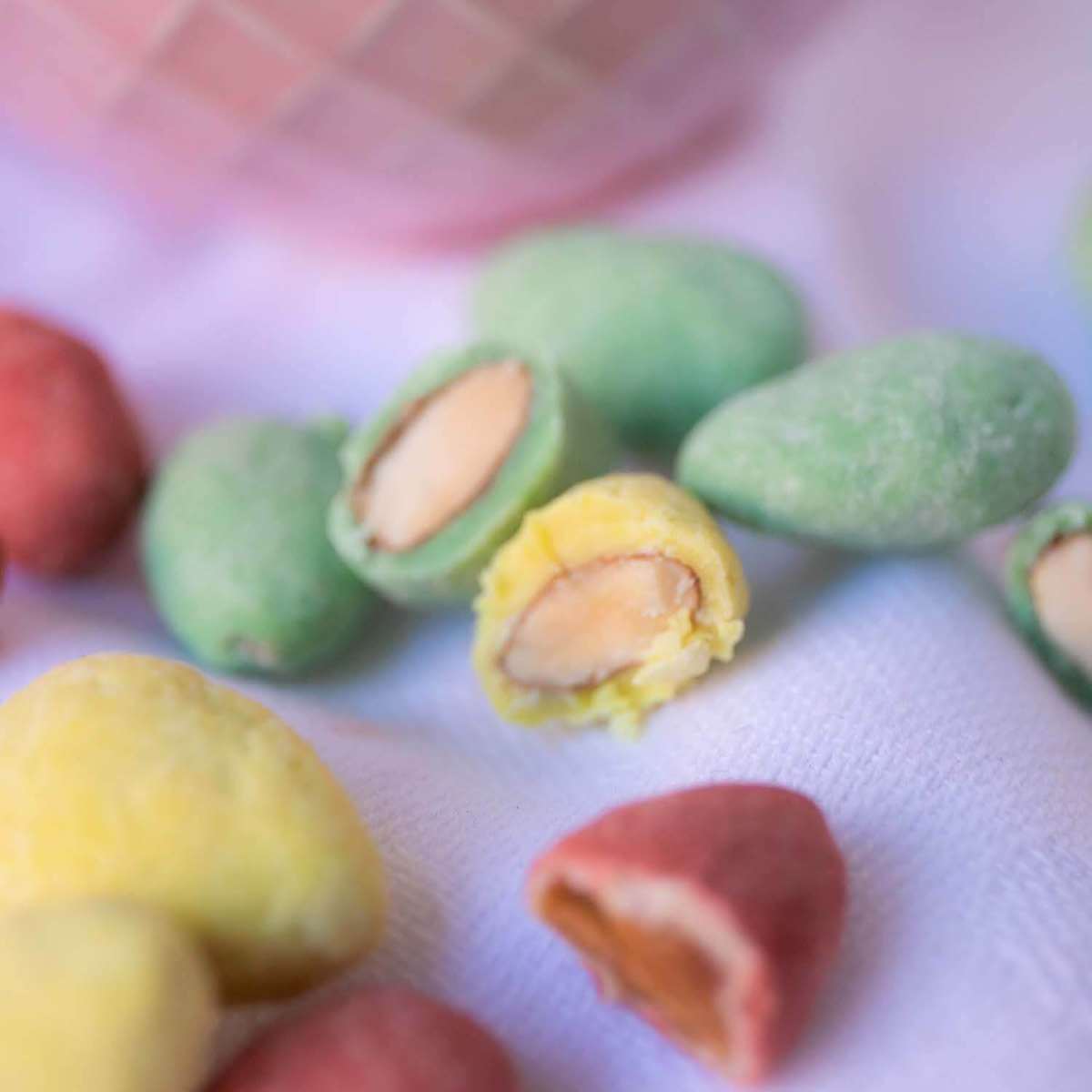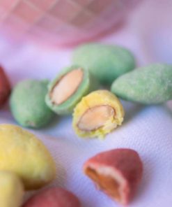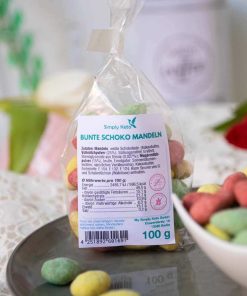 Ingredienti: Mandorle , cioccolato bianco: (burro di cacao, latte intero in polvere (25%), edulcorante: eritritolo, stevioglicosidi di Stevia (0,027%); latte scremato in polvere (15%), inulina, emulsionante: lecitina di girasole; aroma naturale di vaniglia); Burro di cacao, colori: E 104, E 132, E 124. Può contenere tracce di uova e frutta a guscio (noci).