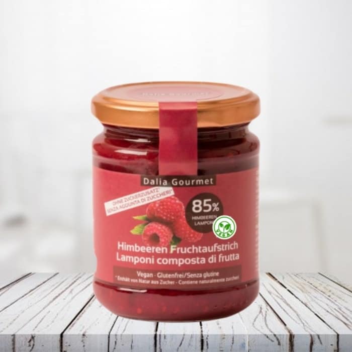Ingredienti: lamponi (UE) 85 %, dolcificanti (eritritolo, glicosidi steviolici), sambuco nero concentrato, gelificante: pectina di mele.