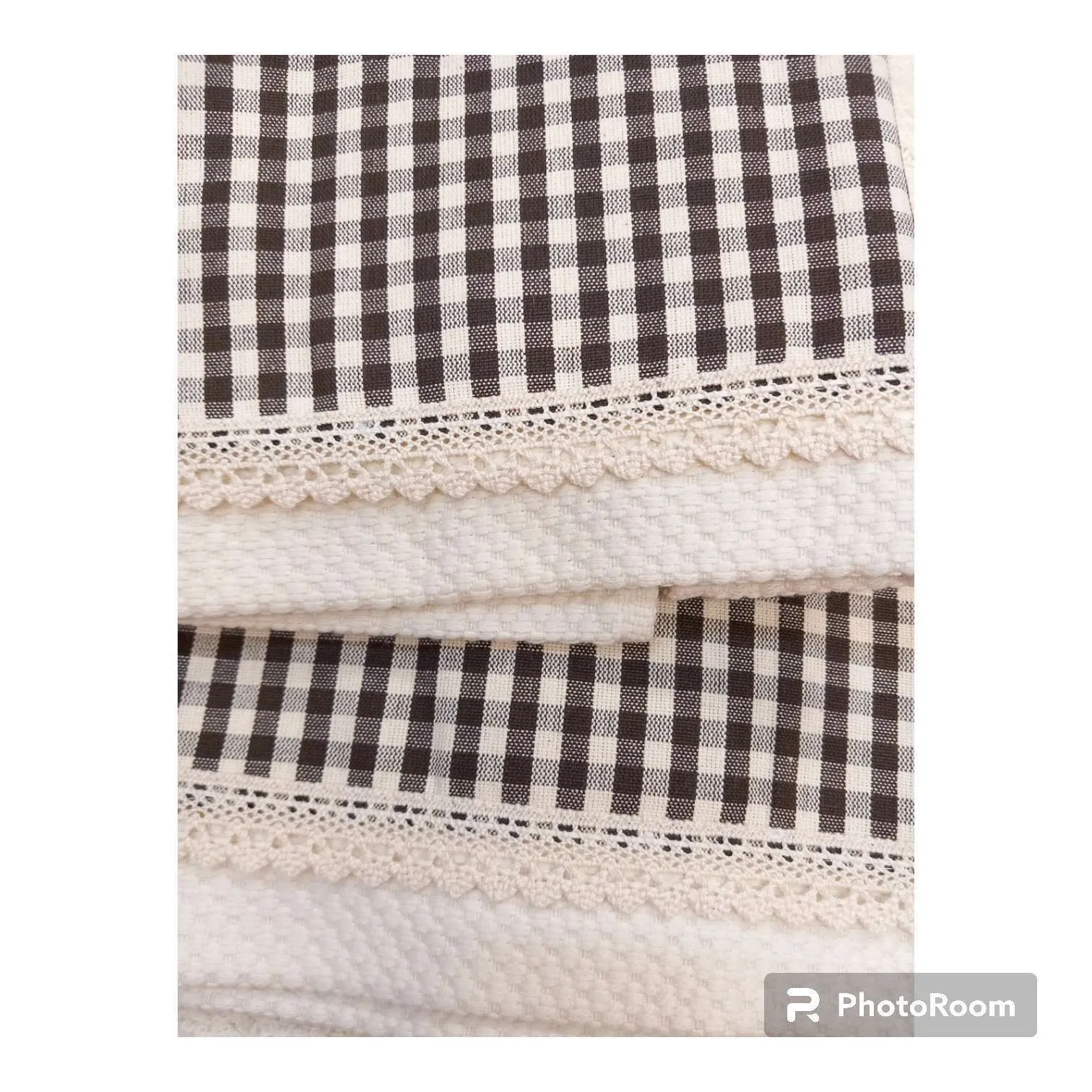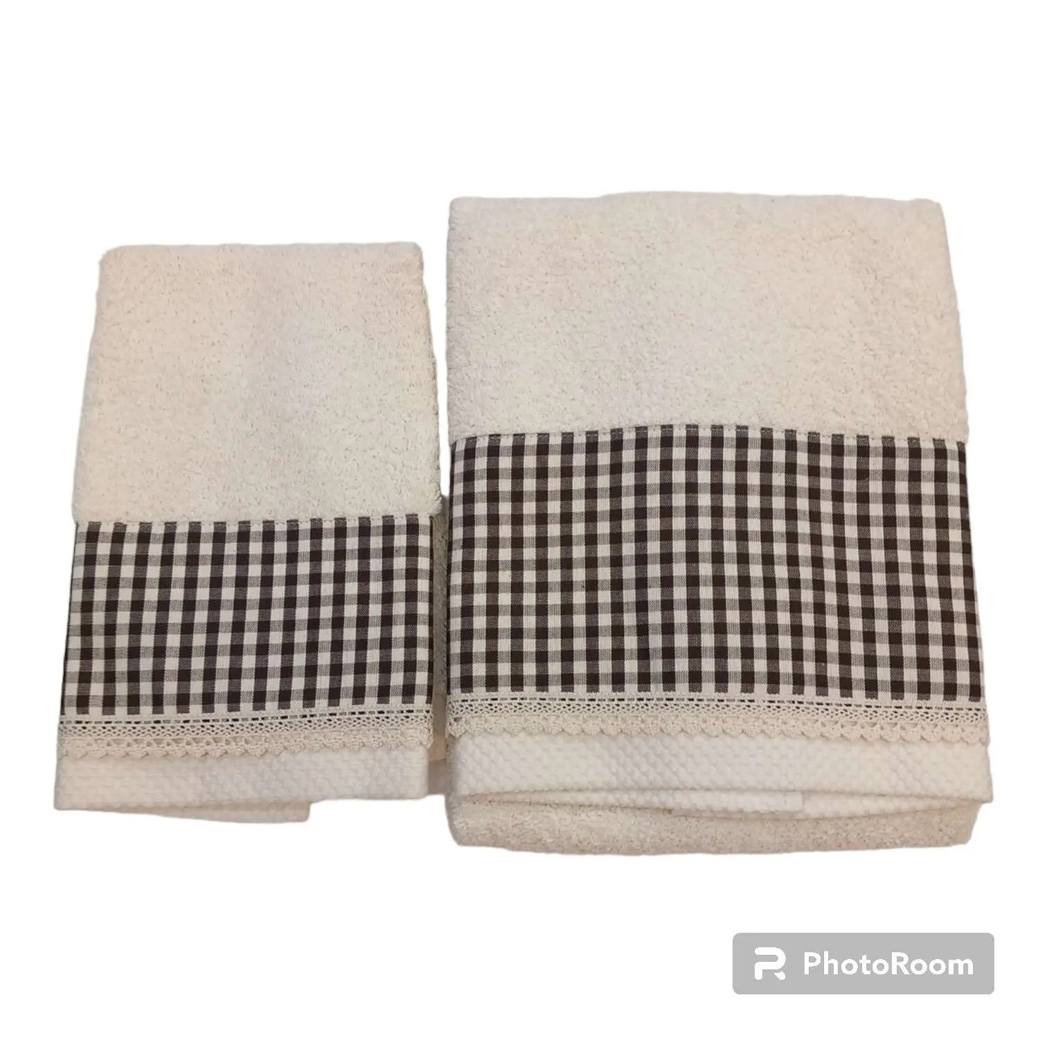 Set asciugamani 2pz con striscia fantasia quadretti e rifinitura in pizzo