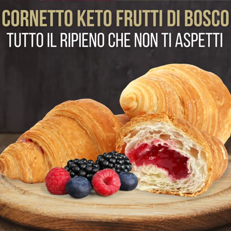 Delizioso cornetto chetogenico ripieno di marmellata ai frutti di bosco senza zucchero. I laboratori pasticceri di Pronutrition hanno compiuto un vero e proprio miracolo culinario realizzando un cornetto con un gusto ed una fragranza tale e quale al cornetto del bar, ma comunque in perfetto stile cheto a bassissimo tenore di carboidrati e con un ripieno di marmellata ai frutti di bosco deliziosa, avvolgente e gustosa. La qualità delle materie prime, le nuove tecnologie, ma soprattutto l’esclusività della ricetta chetogenica rende il cornetto Pronutrition un vero e proprio piacere per il palato senza perdere di vista la tabella nutrizionale dove gli zuccheri e i carboidrati sono ai minimi termini. Una ricetta semplicemente perfetta. Il cornetto chetogenico contiene solo 2,94 gr di carboidrati e 0,37 gr di zuccheri per porzione.