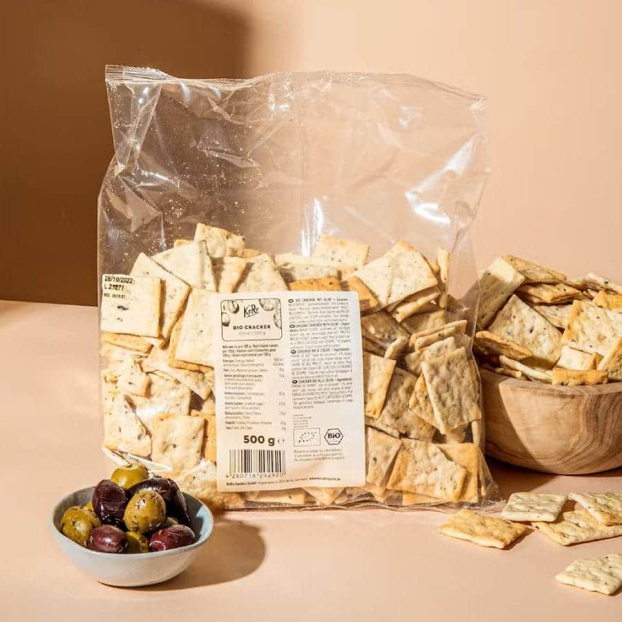 Un sostanzioso cracker biologico senza uova, lievito, burro, ma vegano e direttamente dall’Italia – signore e signori, abbiamo stravolto il gioco dei cracker. I cracker sono lo spuntino preferito di qualsiasi festa o celebrazione. Insieme al piatto di formaggio e prosciutto, un bicchiere di vino e deliziose salsine, sarai l’ospite più gradito in men che non si dica. Festa spontanea in giardino? Nessun problema! Basta aprire la confezione di cracker, usare la nostra crema di pomodoro e basilico o di ceci e dare inizio alla festa. Se hai un po’ più di tempo, puoi anche fare una deliziosa insalata di feta, olive e anacardi e condirla con alcuni peperoni e cetrioli. I cracker al posto delle patatine non sono mai stati così invitanti!