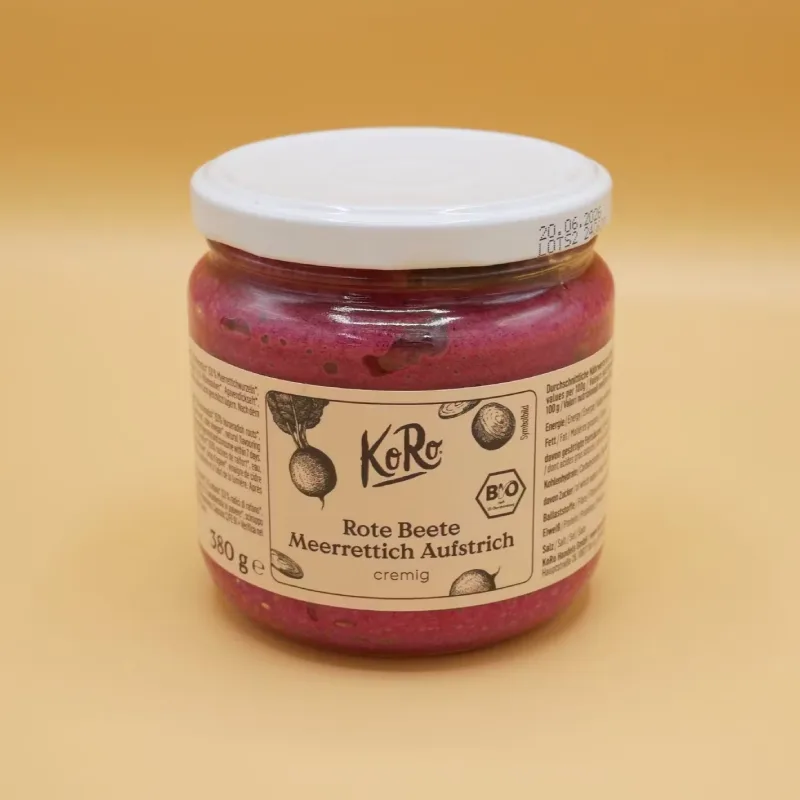 | Ingredienti | 35 % barbabietola*, olio di colza*, 18 % semi di girasole*, 5 % rafano* (53 % radice di rafano*, acqua, aceto di mele*, olio di girasole*, succo di mela*, sale marino, addensante: gomma di guar*), succo di limone*, acqua, 3,5 % barbabietola in polvere*, sciroppo d’agave*, aceto di mele*, aroma naturale (SENAPE), sale *da agricoltura biologica |