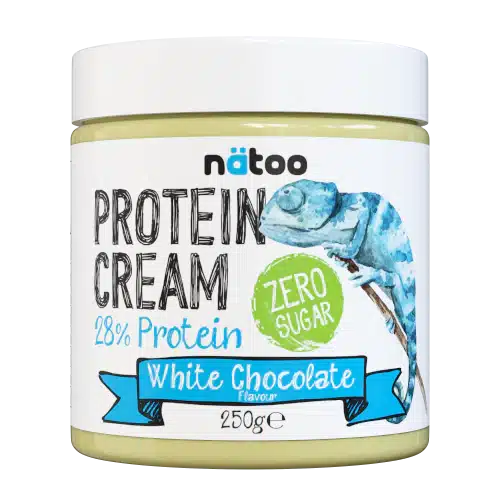 Protein Cream Cioccolato Bianco di Natoo è una deliziosa crema spalmabile al gusto di cioccolato bianco ad elevato contenuto proteico (ben il 28% di proteine derivate da sieroproteine isolate). Ideale per uno spuntino proteico goloso, in particolare se spalmata su PROTEIN TOAST, PROTEIN BREAD o PROTEIN CRUSTY di Natoo.