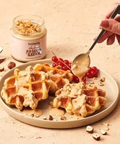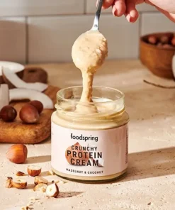 Crema spalmabile alla nocciola con proteine del siero di latte, scaglie di nocciola e fiocchi di cocco. Con edulcorante.