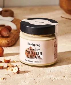 Crema spalmabile alla nocciola con proteine del siero di latte, scaglie di nocciola e fiocchi di cocco. Con edulcorante.