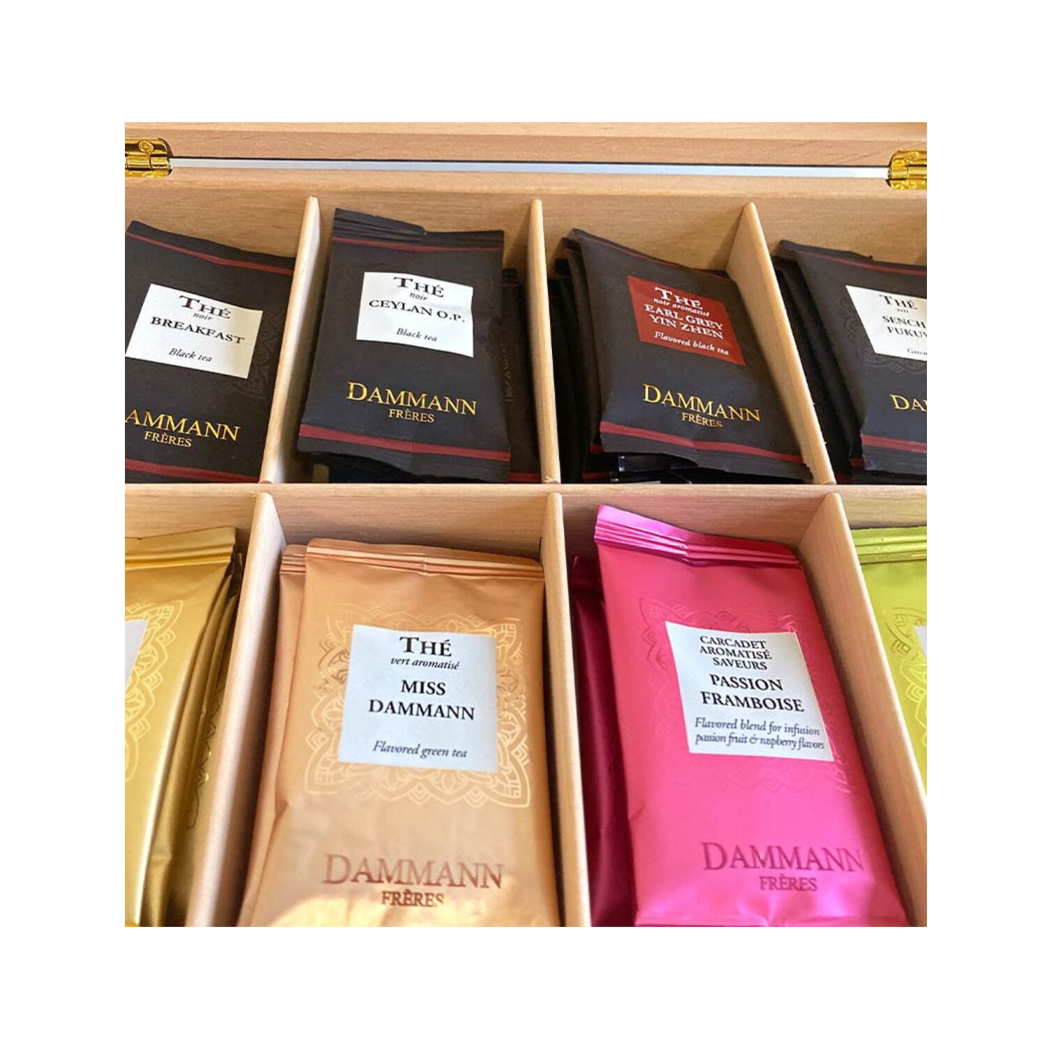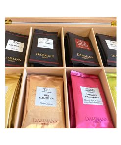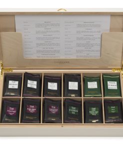- “Coffret Palace”: assortimento di tè e tisane, in sacchetti cristal, conservati ognuno in singole bustine e contenuti all’interno di un pregiato cofanetto in legno suddiviso in scompartimenti. I gusti sono così assortiti: 6 x tè nero english breakfast, 6 x tè nero Darjeeling, 6 x tè nero lampone, ciliegia e vaniglia, 6 x tè nero Earl Grey Yin Zhen al bergamotto, 6 x tè verde Sencha Fukuyu, 6 x tè nero rabarbaro e fragolina di bosco, 6 x tisana camomilla, 6 x tè verde al gelsomino, 6 x tè verde aroma di arancia, 6x tè verde litchi, pompelmo e pesca, 6 x tè bianco albicocca e frutto della passione, 6 x tisana verbena, tiglio e menta. Totale 72 bustine. Prodotto confezionato in Francia. (136.8 grammi).