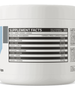 Aminoacidi a catena ramificata BCAA (L-leucina, L-valina, L-isoleucina), involucro della capsula (gelatina, acqua purificata), L-lisina cloridrato, L-treonina, L-fenilalanina, L-metionina, L-arginina, L -istidina, L-triptofano.