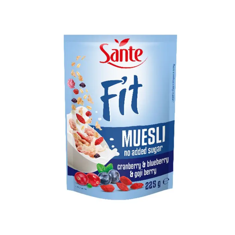 Ingredienti del Muesli FIT Senza Zucchero : Fiocchi di cereali integrali 77,3% (frumento, riso), frutta secca 18% in proporzione variabile [uvetta (uva passa, olio di semi di cotone e/o olio di girasole e/o olio di colza), datteri ( datteri, farina di riso), bacche di goji, mirtilli], succhi di frutta concentrati 3% (mela, ciliegia), mirtilli rossi liofilizzati 0,6%, sale marino.