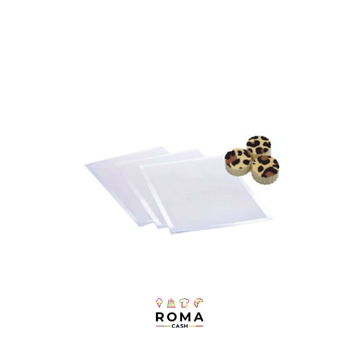 Foglio di acetato trasparente ricoperto di Burro di Cacao, ideale per qualsiasi tipo di decorazione su cioccolatini o torta di cioccolato.