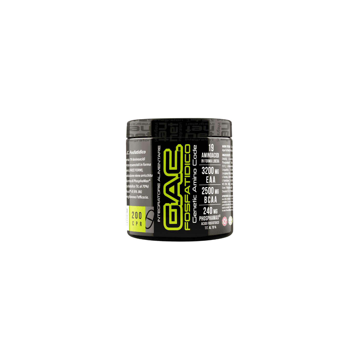 INGREDIENTI: L-Leucina, Cellulosa Microcristallina E460(i), L-Isoleucina, L-Valina, L-Lisina HCl, PhosphaMax® (Acido Fosfatidico Tit. al 70 %, SOIA; Silicio Biossido E551), L-Glutamina Ajinomoto®, L-Treonina, Acido L-Aspartico, L-Cistina, L-Ornitina Alfachetoglutarato, L-Arginina Alfachetoglutarato, L-Fenilalanina, L-Alanina, L-Tirosina, L-Metionina, L-Taurina, L-Citrullina DL-Malato, L-Triptofano, L-Istidina HCl, Glicina, Quali®-B [Piridossina HCl (Vit. B6)]; Altri Ingredienti: Silicio Biossido E551, Esteri Poligliceridi degli Acidi Grassi E472 Magnesio Stearato E572, Polivinilpirrolidone E1201.