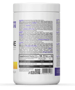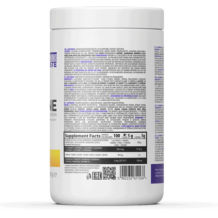 L-glutammina, correttore di acidità – acido citrico, aroma, taurina, edulcoranti: sucralosio, acesulfame K; piridossina cloridrato (vitamina B6). L’integratore alimentare. Contiene edulcoranti. Il prodotto può contenere latte (incluso lattosio), soia, arachidi, altra frutta a guscio, semi di sesamo, avena, uova, crostacei, pesce.