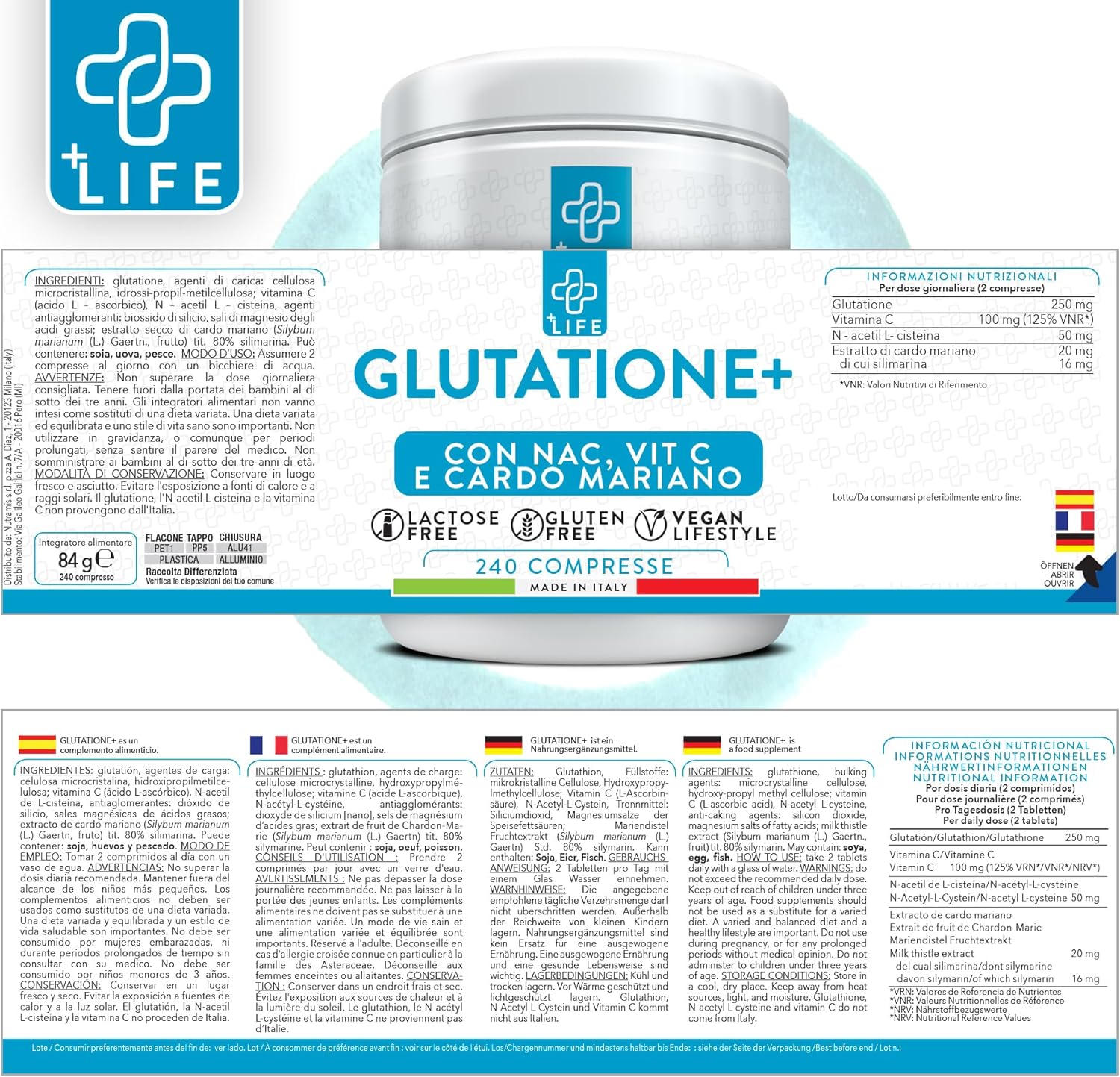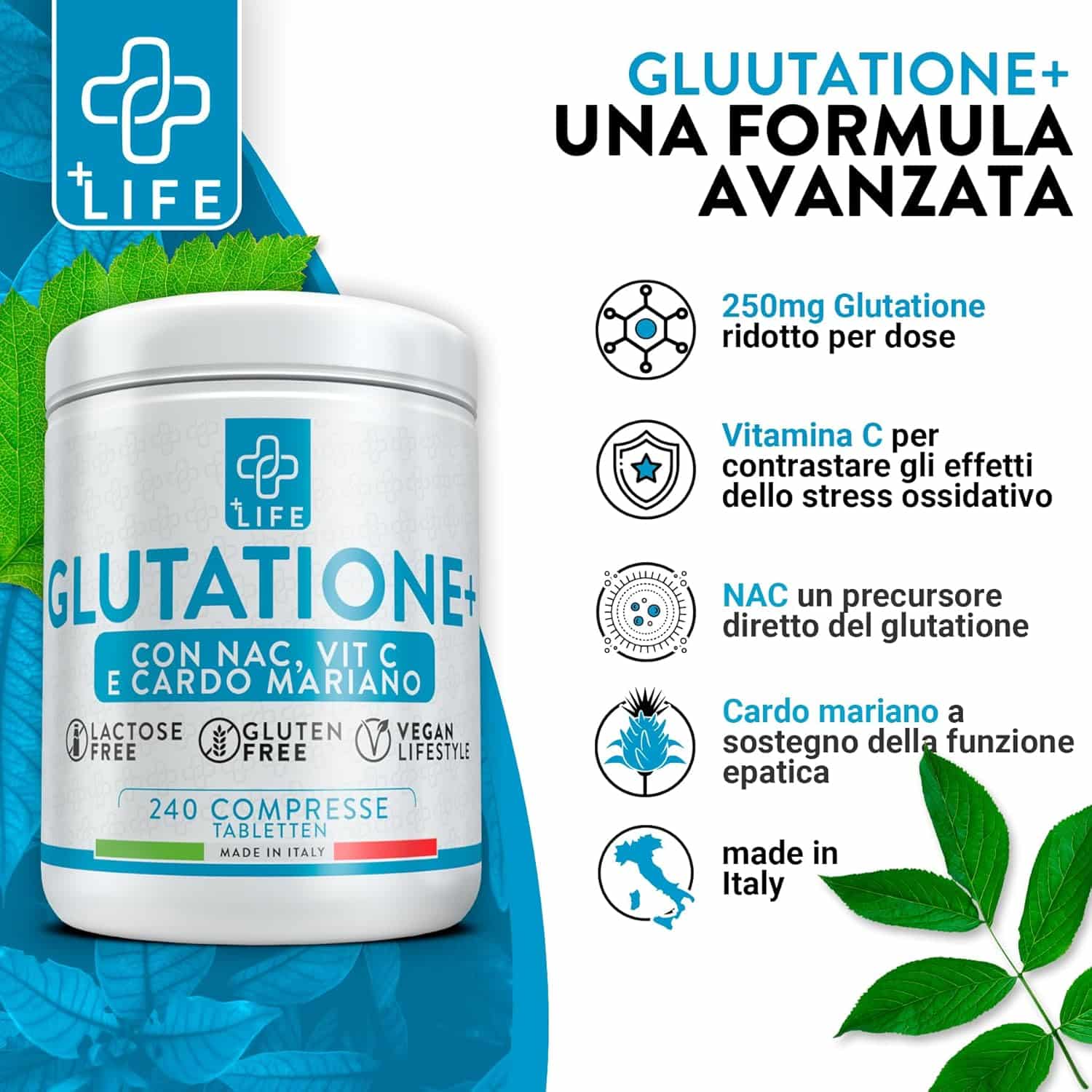 Ecco perché Glutatione+ di +Life è stato formulato: un integratore alimentare avanzato che combina glutatione, vitamina C, N-Acetil L-Cisteina (NAC) ed estratto di Cardo Mariano per offrire un supporto antiossidante completo, favorire la detossificazione epatica e promuovere il benessere generale.