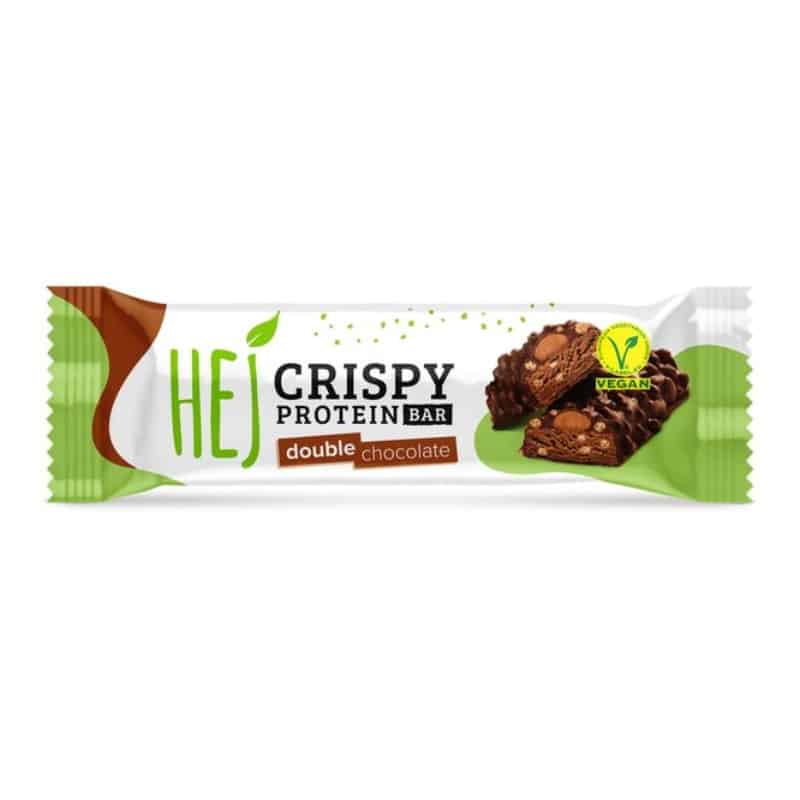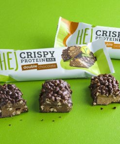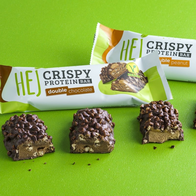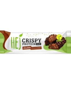 Con un centro di crema di cacao gommoso, fave di cacao tostate e finissimo cioccolato semidolce, HEJ Vegan Crispy Double Chocolate è un intenso piacere per uno spuntino al cioccolato.