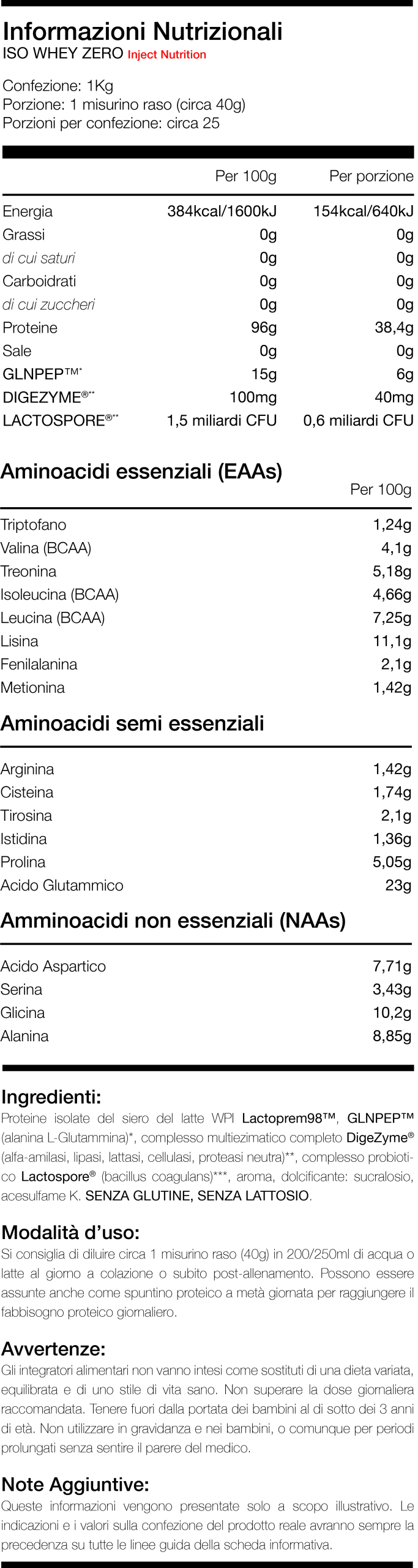 • Profilo aminoacidico ricco di EAAs, aminoacidi semi essenziali (14g a porzione) e NAAs (12g a porzione) a rilascio veloce;