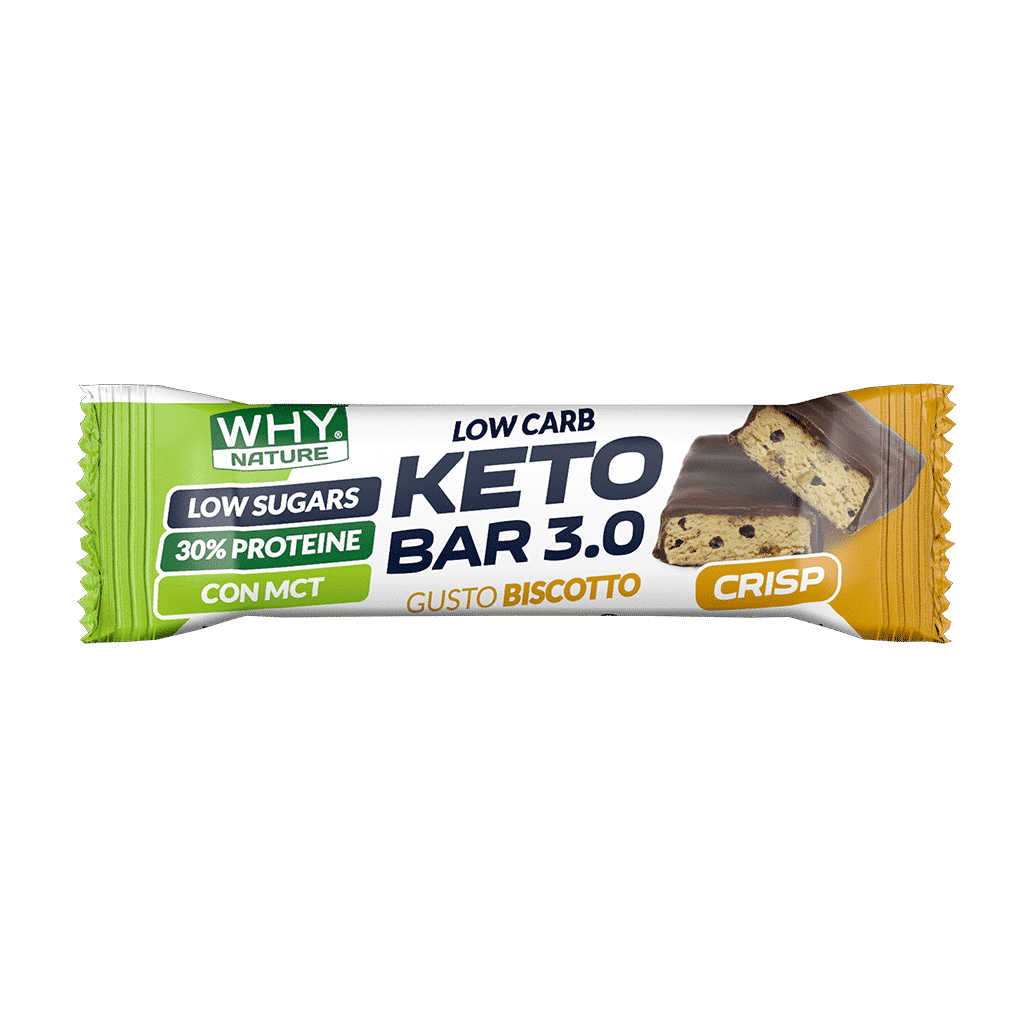 Keto bar 3.0 è una barretta a basso contenuto di zuccheri e ad alto contenuto di fibre e proteine (30%). Disponibile in quattro varianti, tutte in versione crisp: cacao, wafer nocciola, cocco e biscotto.