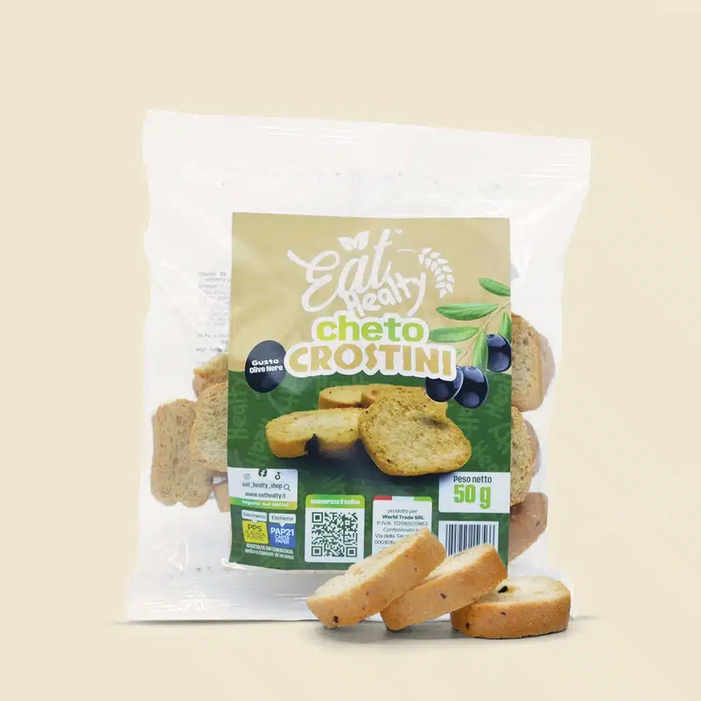 Lo snack che porti sempre con te: i Chetocrostini alle olive nere sono disponibili in confezioni da 50g.