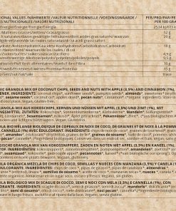 | Mix di granola biologico di scaglie di cocco, semi e noci con mela (3,5%) e cannella (1%), con dolcificante. Ingredienti: scaglie di cocco*, semi di girasole*, semi di zucca*, mandorle * , dolcificante* (eritritolo), semi di lino*, semi di sesamo * , olio di cocco*, mele essiccate*, noci pecan * , cannella*. (*ingrediente biologico). | |