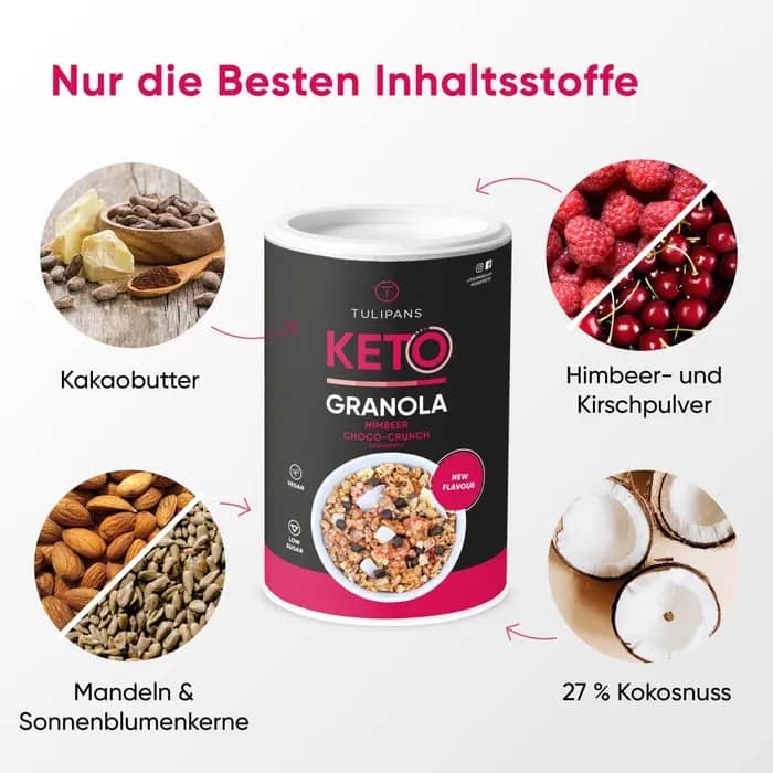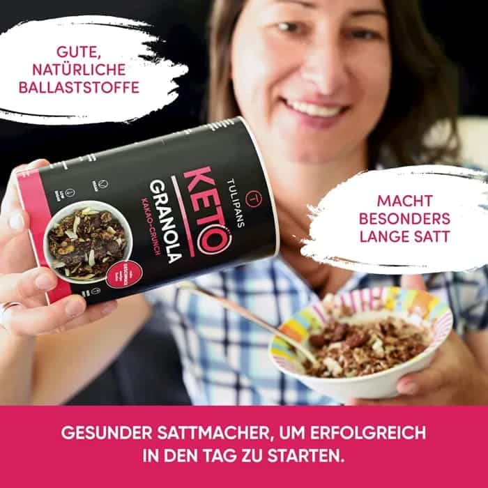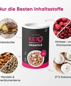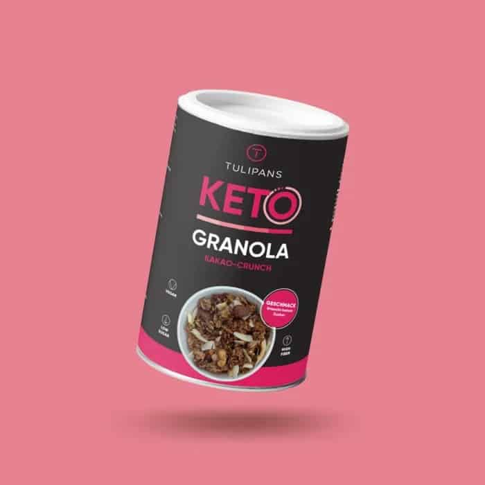 La croccante KETO GRANOLA non contiene zuccheri aggiunti. L’eritritolo è usato come dolcificante, che, a differenza di altri dolcificanti, non ha alcun effetto sui livelli di zucchero nel sangue e ha molte meno calorie dello zucchero.