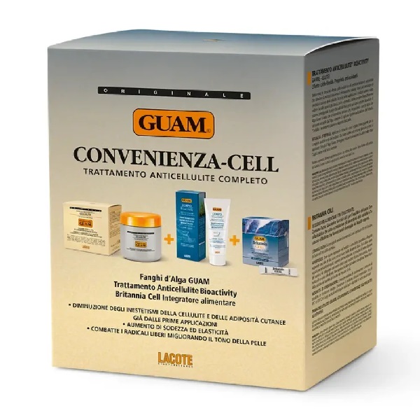 Il Kit Convenienza – Cell contiene Fanghi d’Alga Guam 500 g, Trattamento Anticellulite Bioactivity 200 ml, Britannia Cell Integratore Alimentare 30 bustine.